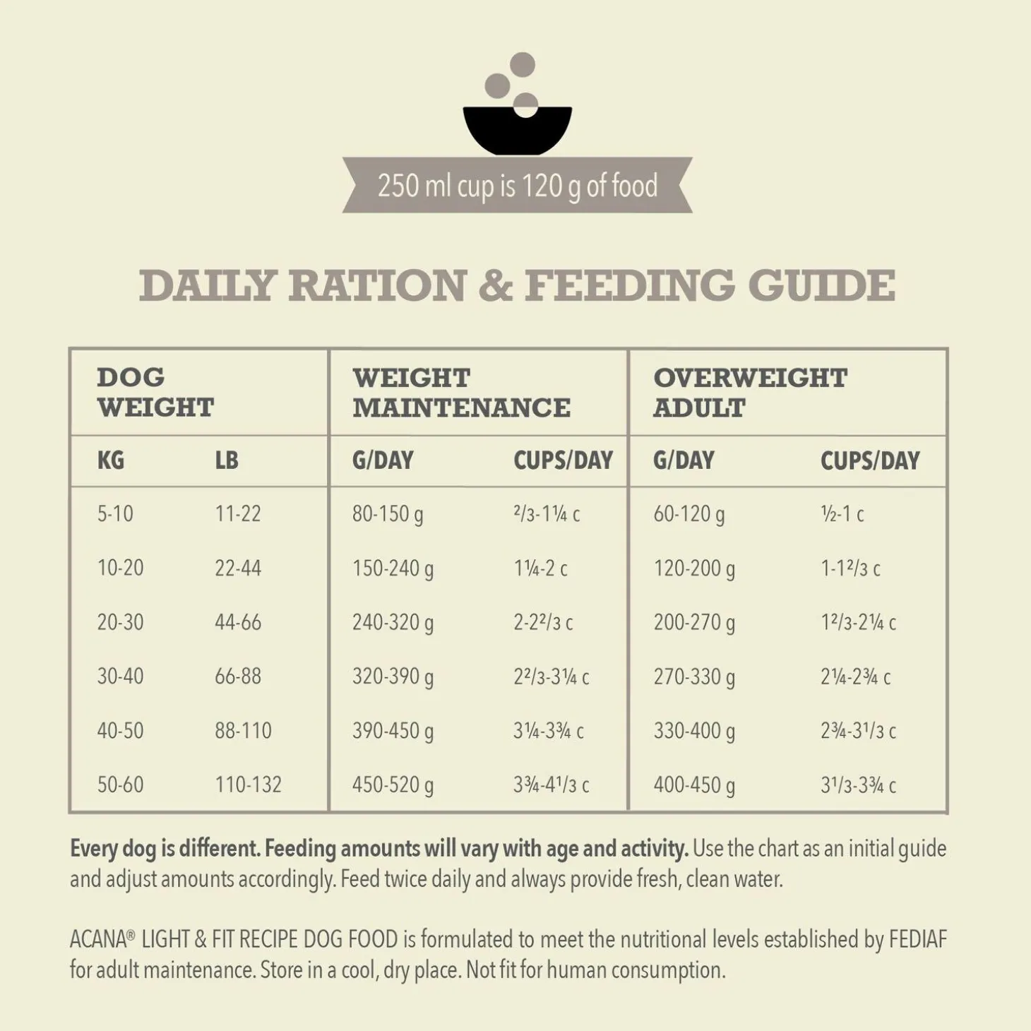 - Lower in calories than other ACANA Dog recipes to help support a healthy weight in your dog.