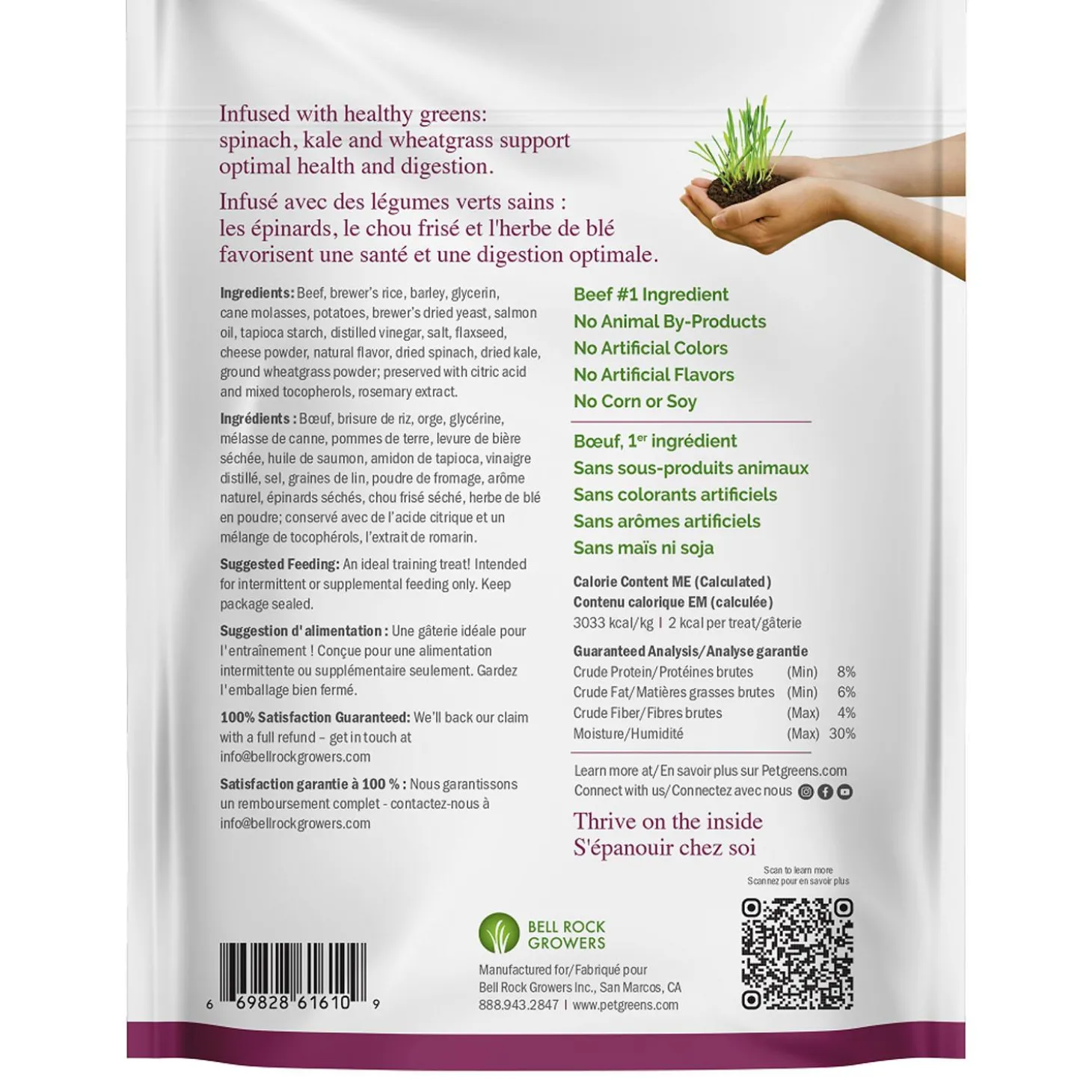 Pet Greens Li’l Treats Beef Recipe Dog Treats are full of flavour and are naturally pure, nutritious greens! These little bite-size treats are perfect for small dogs, puppies, training and contain no wheat gluten, corn, soy, or artificial colours or flavours. The added nutritional benefits of wheatgrass, kale and spinach support your pet’s overall health in this tiny, mighty training treat!