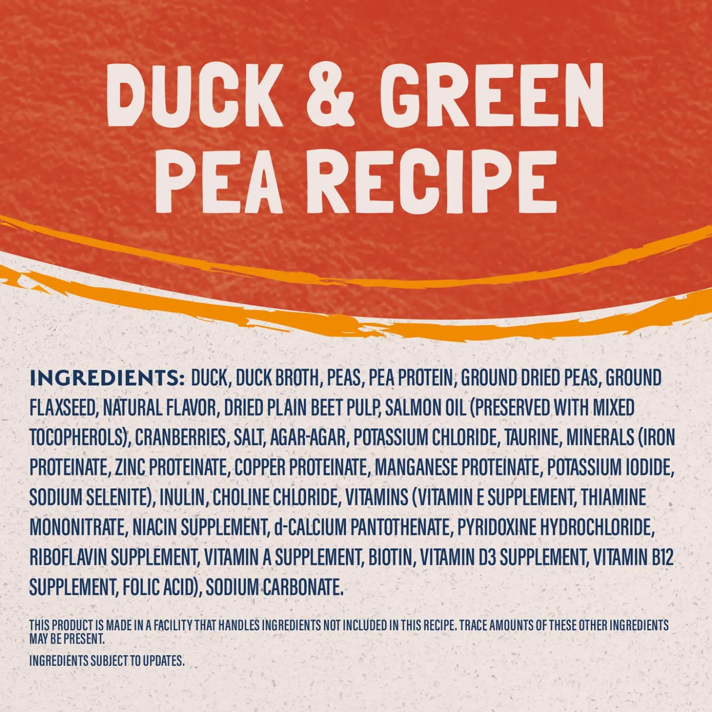 Duck, Duck Broth, Peas, Pea Protein, Ground Dried Peas, Ground Flaxseed, Natural Flavor, Dried Plain Beet Pulp, Salmon Oil (Preserved With Mixed Tocopherols), Cranberries, Salt, Agar-Agar, Potassium Chloride, Taurine, Minerals (Iron Proteinate, Zinc Proteinate, Copper Proteinate, Manganese Proteinate, Potassium Iodide, Sodium Selenite), Inulin, Choline Chloride, Vitamins (Vitamin E Supplement, Thiamine Mononitrate, Niacin Supplement, D-Calcium Pantothenate, Pyridoxine Hydrochloride, Riboflavin Supplement, Vitamin A Supplement, Biotin, Vitamin D3 Supplement, Vitamin B12 Supplement, Folic Acid), Sodium Carbonate.