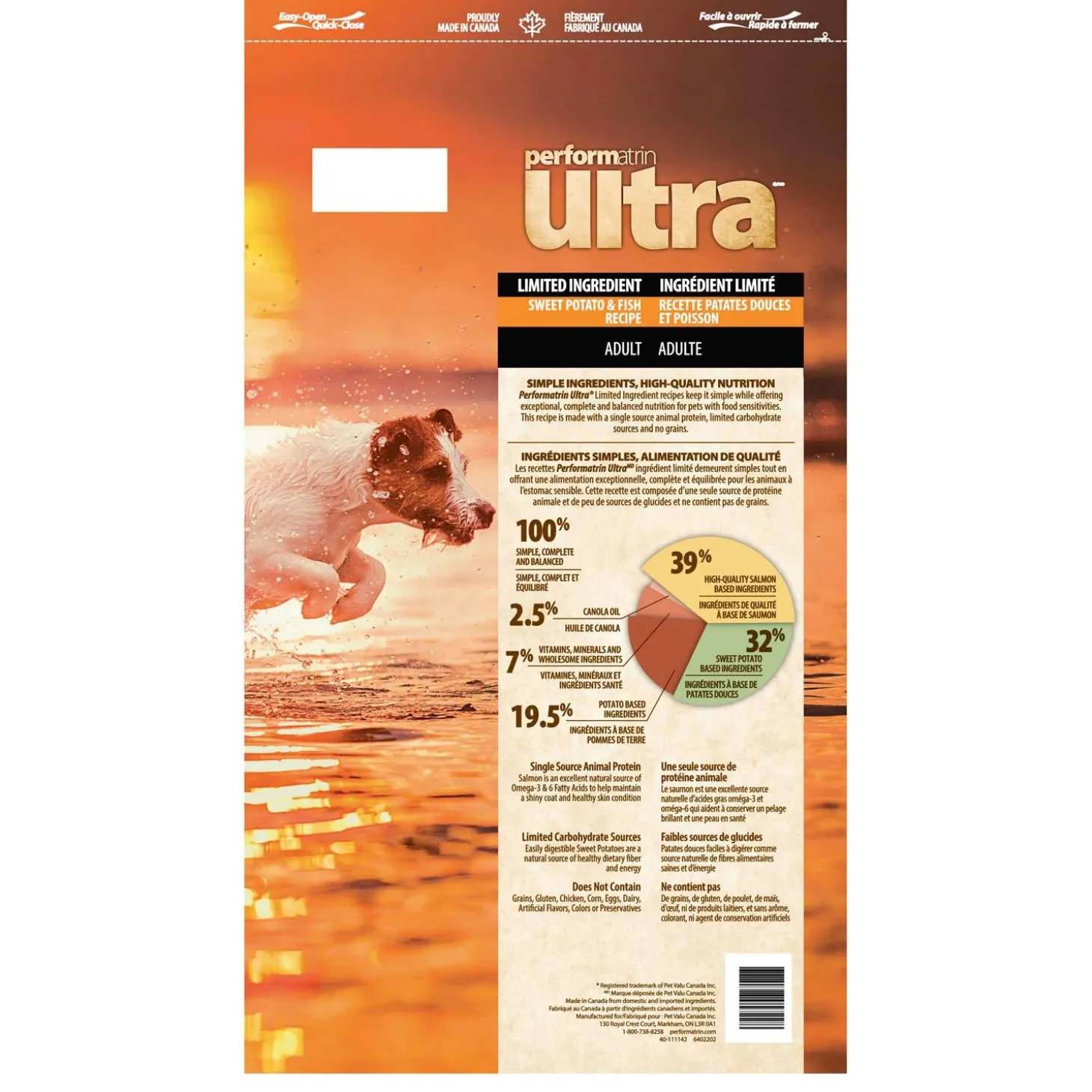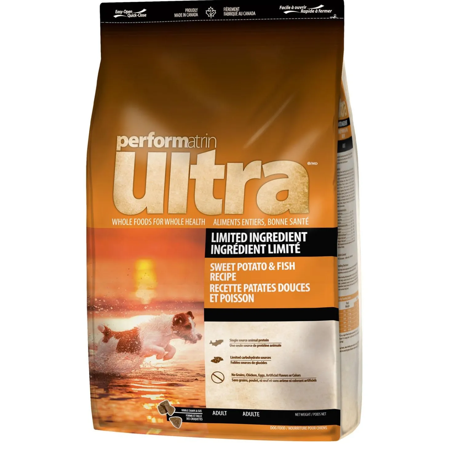 Performatrin Ultra Limited Ingredient Sweet Potato & Fish Recipe Adult Dog Food keeps it simple. With single sourced protein from salmon to support strong muscles, and sweet potato to provide healthy dietary fiber and energy, making this an easy to digest, complete and balanced meal perfect for dogs with food sensitivities. This recipe meets your dog’s daily requirements and promotes whole body health and wellness.