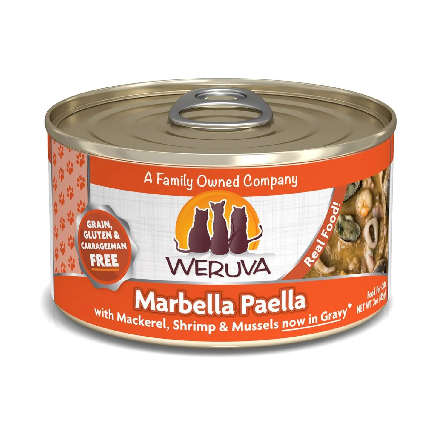 Weruva Marbella Paella with Mackerel, Shrimp & Mussels Adult Cat Food has bold ocean flavours meeting in a seaside feast featuring mackerel, shrimp, and squid. Made from seriously good ingredients you can see, this classic recipe is crafted to please your obligate carnivore at every meal.