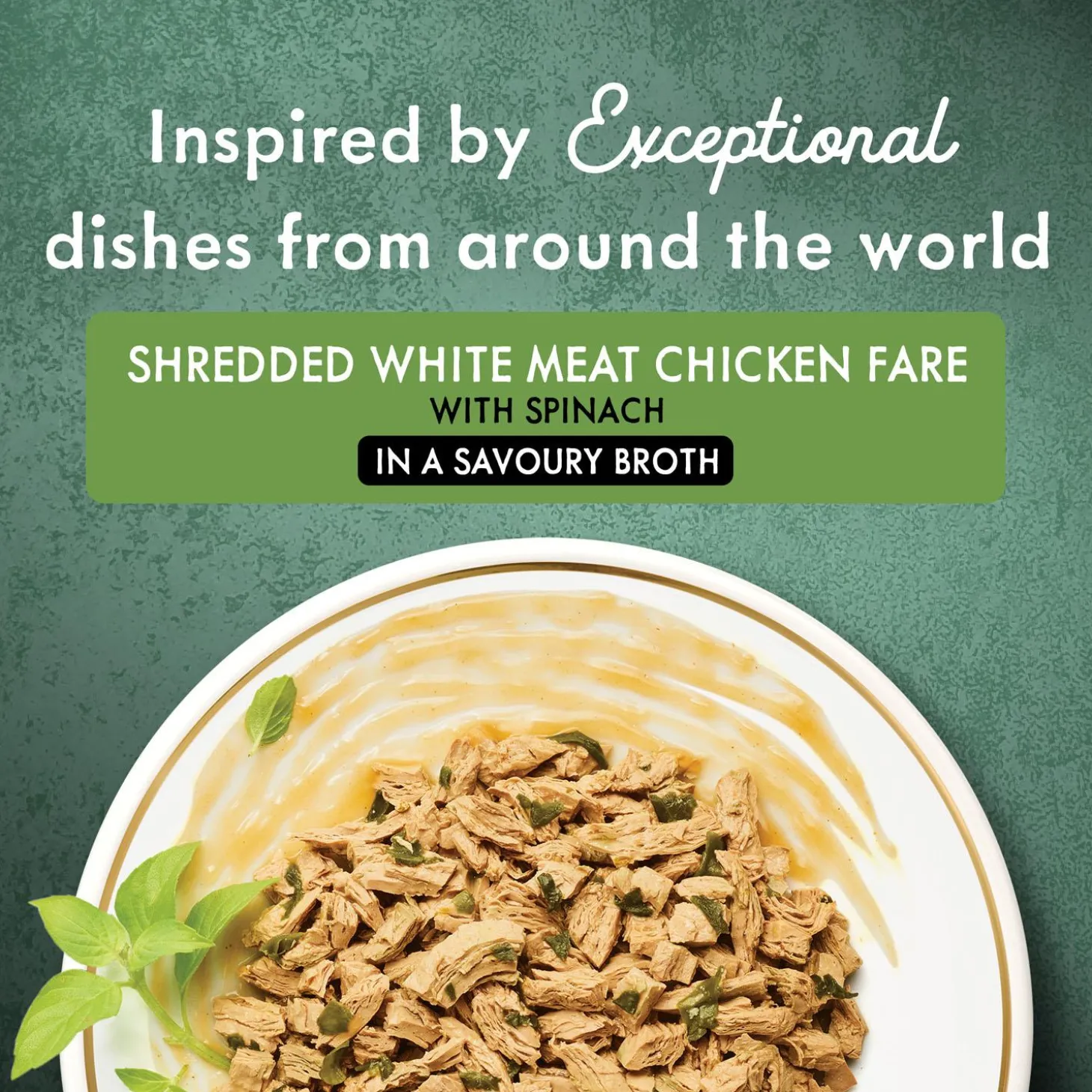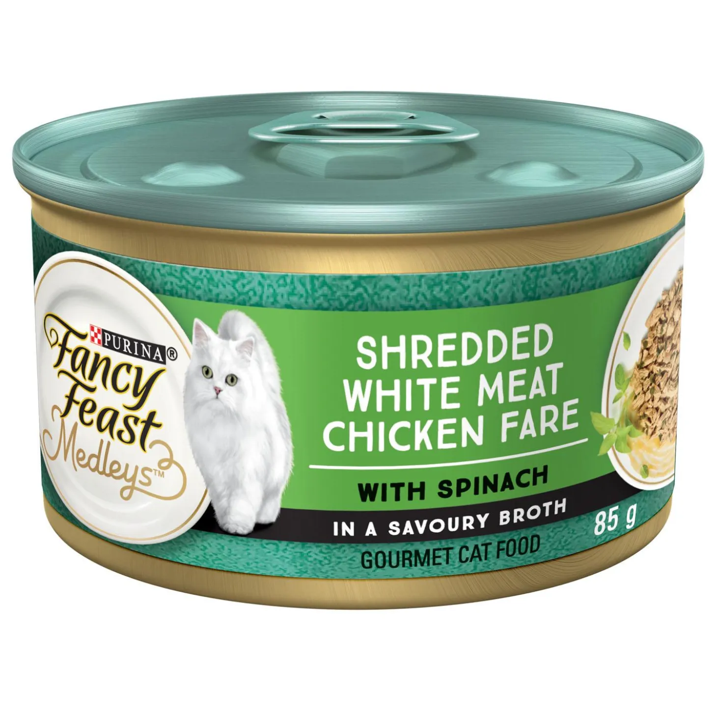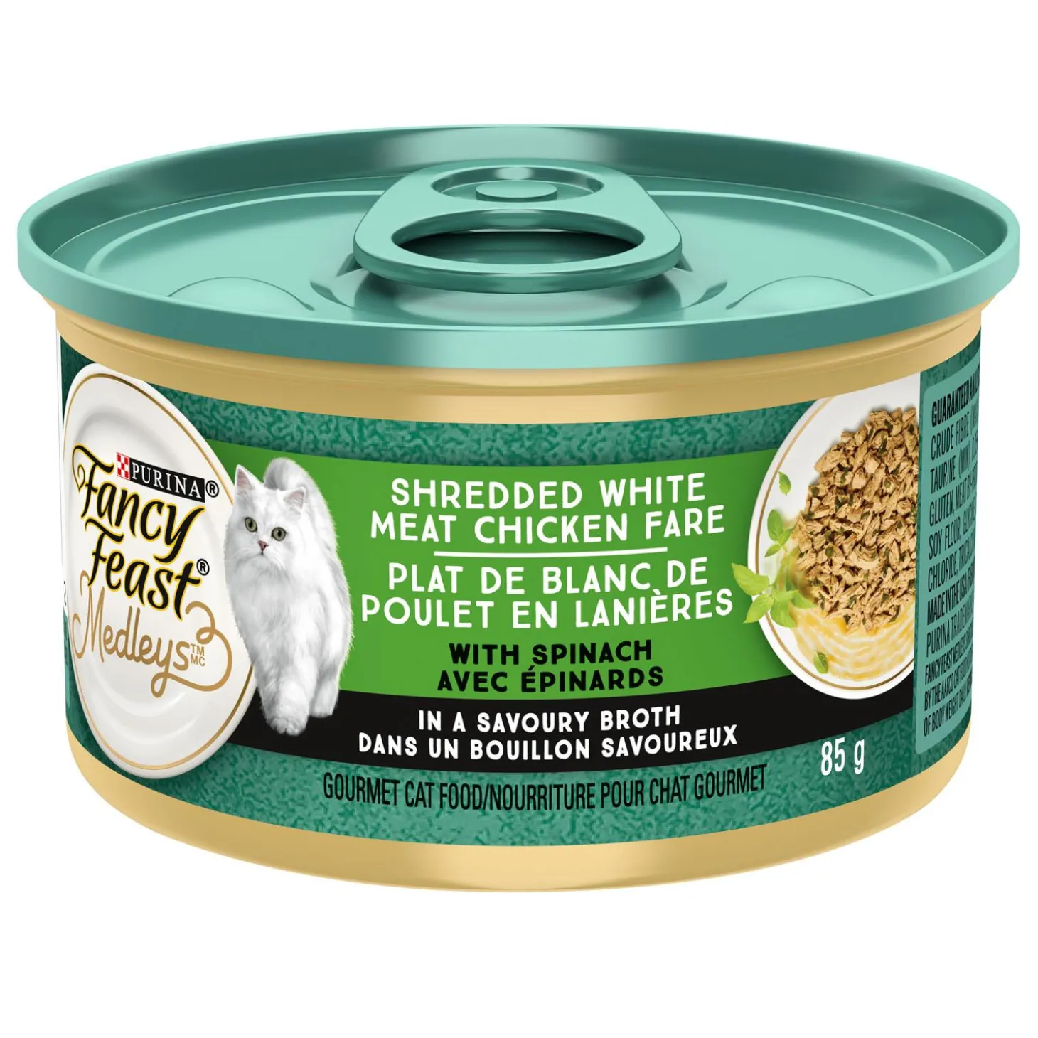 Fancy Feast Medleys Shredded White Meat Chicken Fare Adult Cat Food uses exceptional ingredients to create delicious combinations inspired by dishes throughout the world. Fancy Feast Medleys canned cat food has essential vitamins and minerals to support your cat’s health and wellness. Watch your cat scamper toward the sound of the can opening whenever you serve this high-quality cat food!