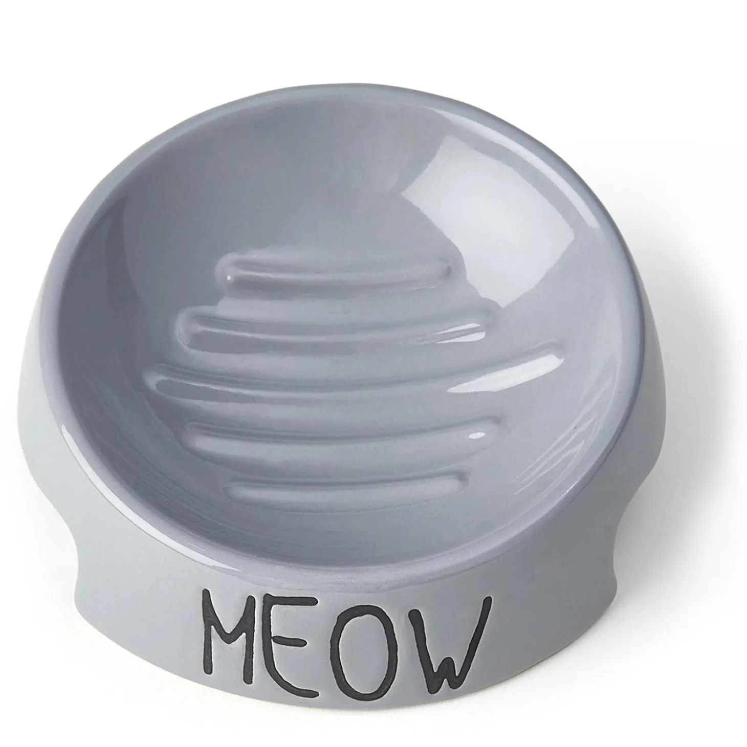 Petrageous Meow Bowl in Grey has a 6-ounce capacity. It measures 4.25 inches in diameter and is 2 inches tall. “MEOW” is scripted and embossed on the exterior and the sides feature easy lift shaping. The basin has embossed ridges that cats enjoy and use to clean their tongues.