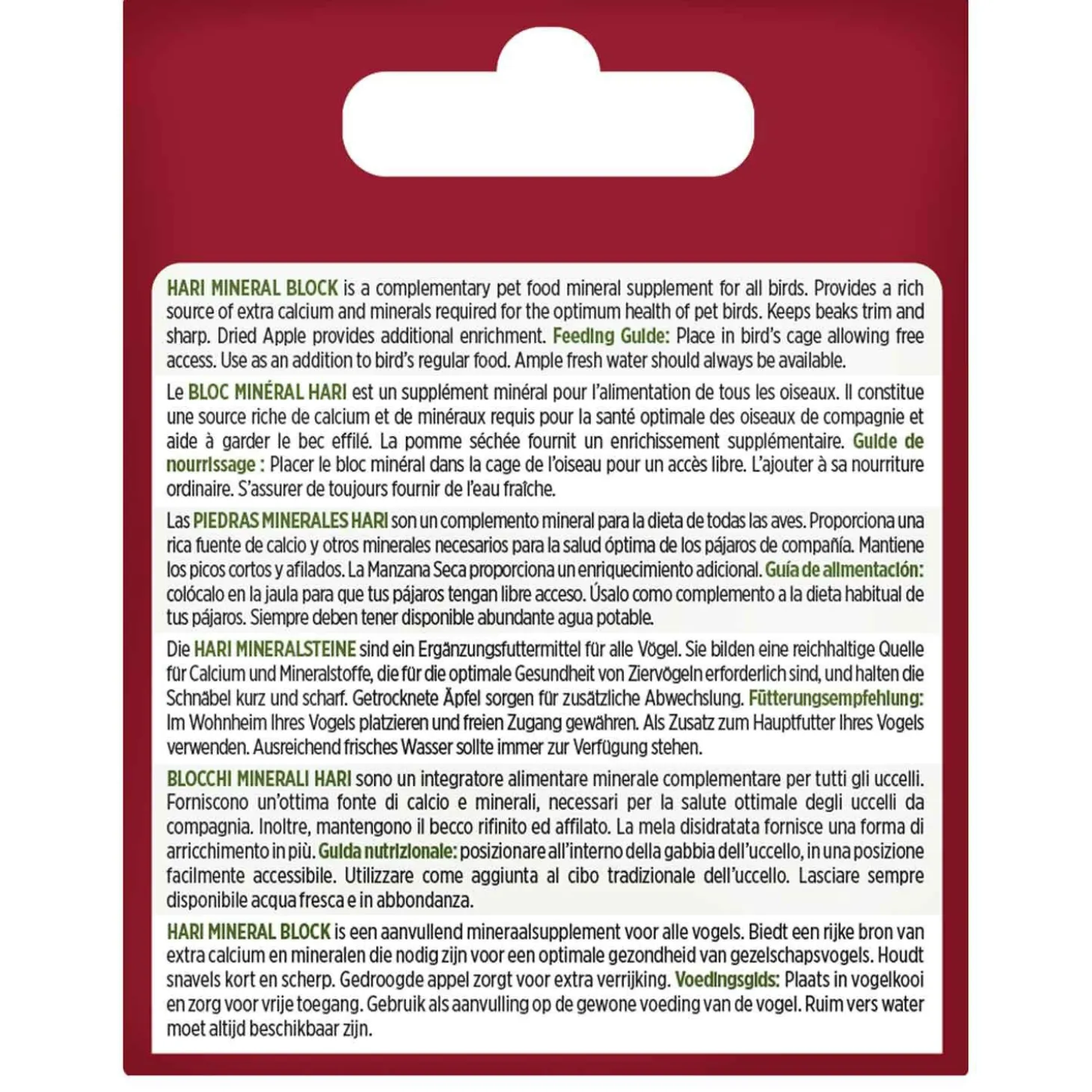 HARI Mineral Block with Dried Apples provides small birds with a rich source of calcium for strong bones and optimal growth. An assortment of tantalizing dried morsels are embedded within the mineral blocks to encourage birds to scrape and chew keeping their beaks trim and healthy all while providing additional enrichment. Made of completely natural ingredients, this mineral block is easy to secure to your feathery friends cage bars with the included cage clip.