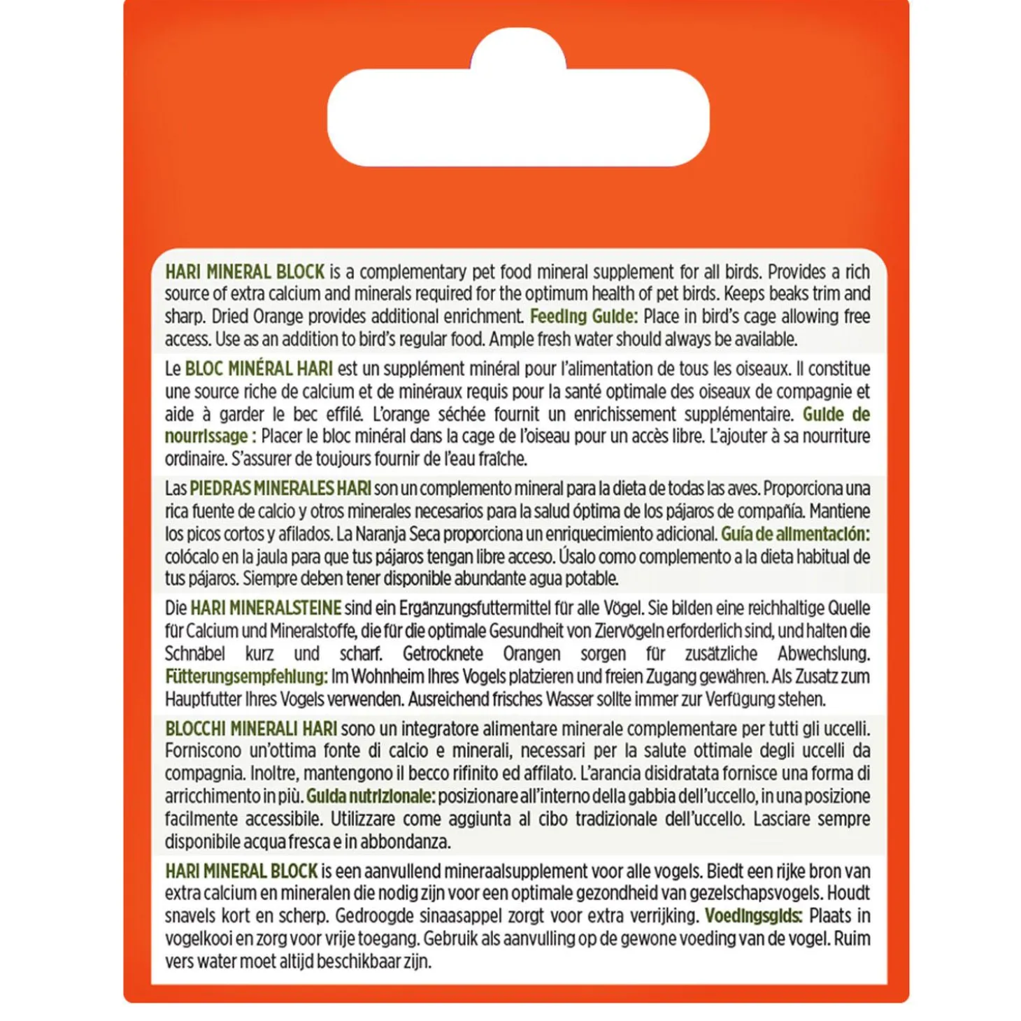 HARI Mineral Block with Dried Orange Peel provides small birds with a rich source of calcium for strong bones and optimal growth. An assortment of tantalizing dried morsels are embedded within the mineral blocks to encourage birds to scrape and chew keeping their beaks trim and healthy all while providing additional enrichment. Made of completely natural ingredients, this mineral block is easy to secure to your feathery friends cage bars with the included cage clip.