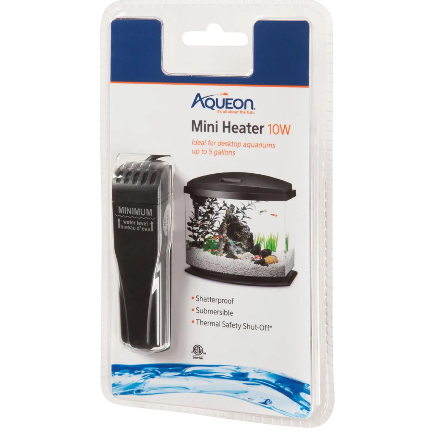Aqueon Mini Heater provides warmth to tropical fish. Designed with a shatterproof housing and thermal safety shut-off, this 10 watt compact and completely submersible mini heater is perfect for desktop aquariums with a minimum size of 9.4L (2.5 gal) and up to 18.9L (5 gal). This heater is also able to be used in both acrylic and glass aquariums. It can be installed vertically or horizontally to fit different aquarium design and the shatterproof construction adds peace of mind with an extra level of safety. With the Aqueon brand, it’s all about the fish!