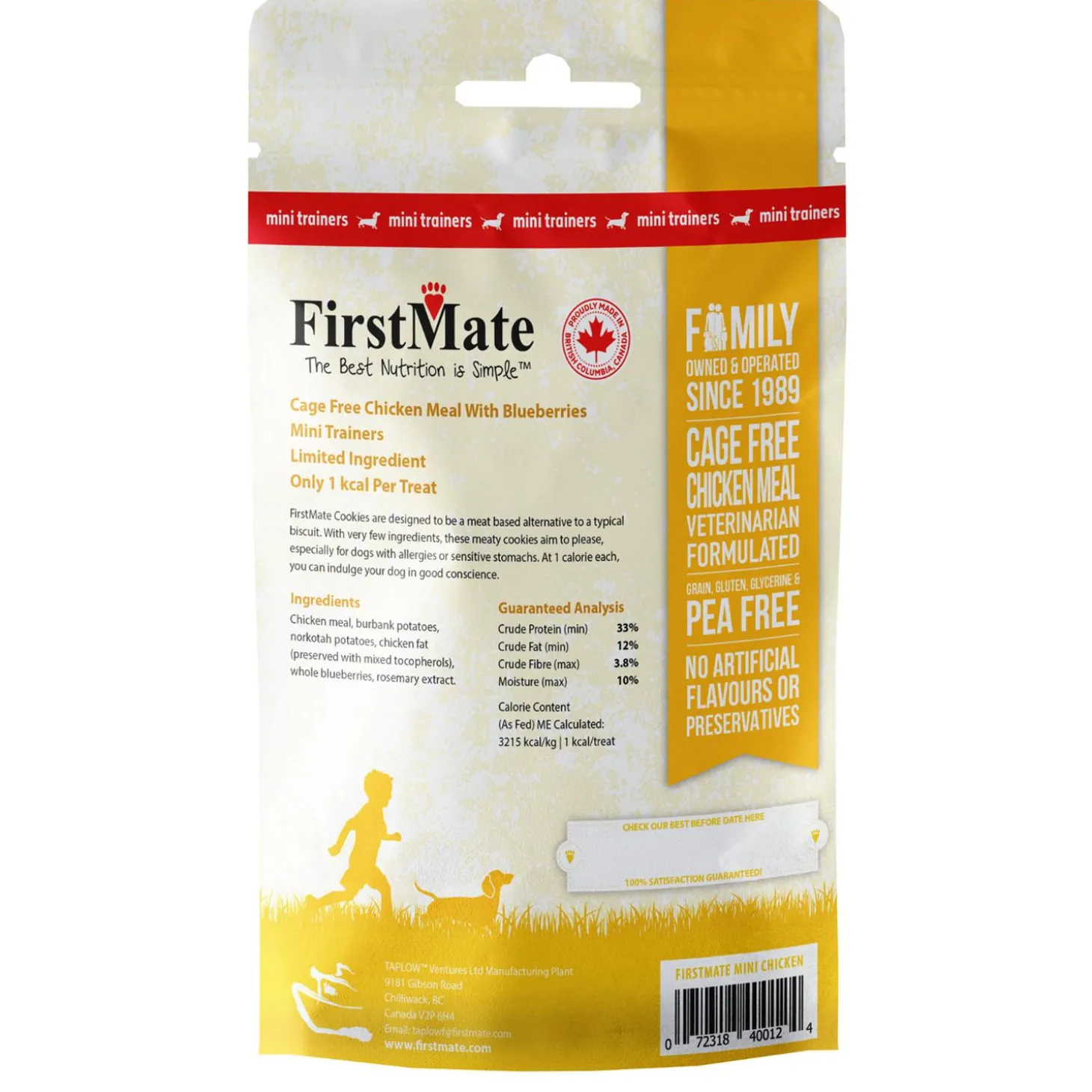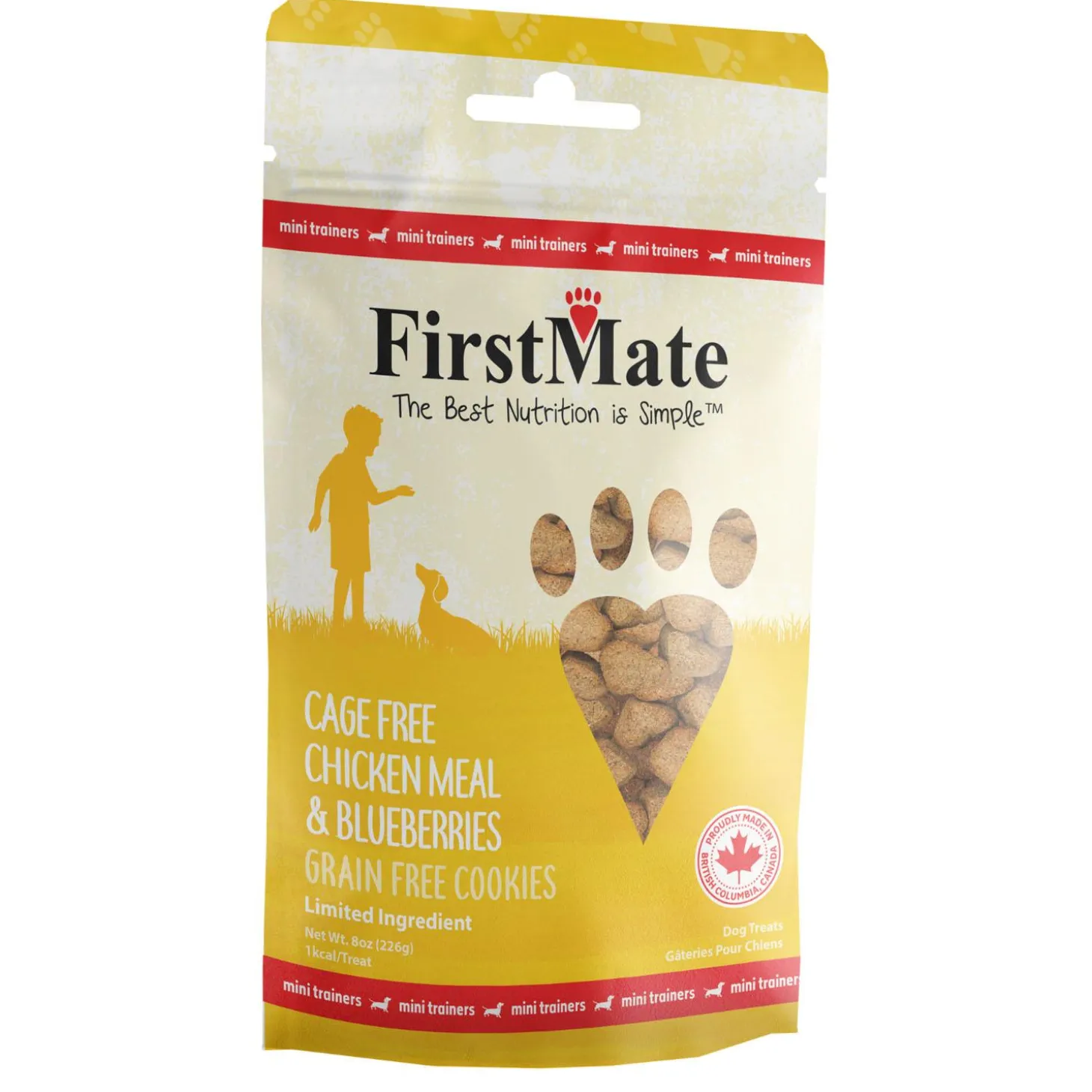 FirstMate Mini Trainers Cage Free Chicken Meal & Blueberries Cookies Dog Treats are Limited Ingredient treats with only 1 kcal per treat. Great for small mouths and long training sessions. These high reward treats are designed to be a meat based alternative to a typical biscuit. This grain, glycerine, and pea free formula is ideal for everyday use as a treat or training aid for your dog.