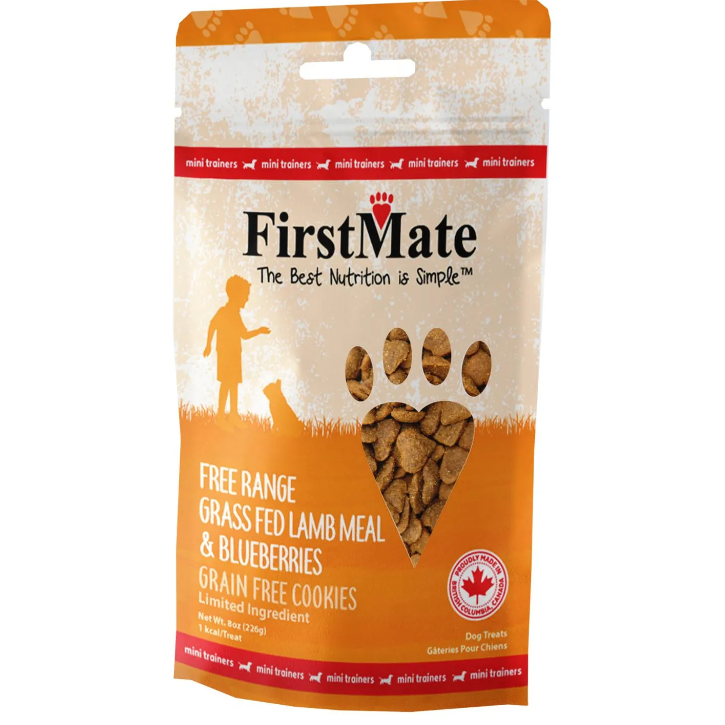 FirstMate Mini Trainers Free Range Grass Fed Lamb Meal & Blueberries Cookies Dog Treats are Limited Ingredient treats with only 1 kcal per treat. Great for small mouths and long training sessions. These high reward treats are designed to be a meat based alternative to a typical biscuit. This grain, glycerine, and pea free formula is ideal for everyday use as a treat or training aid for your dog.