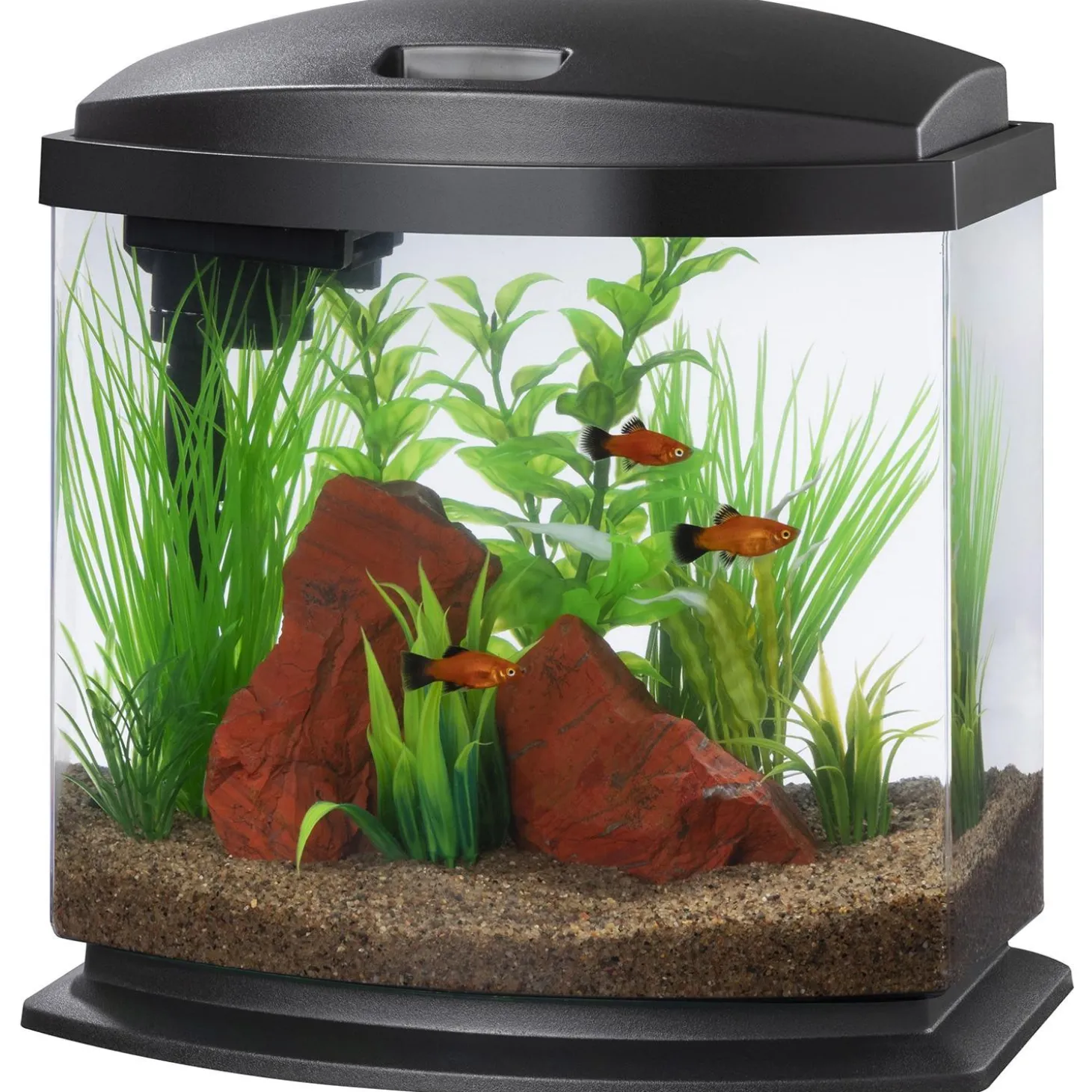 - Includes a clear acrylic vessel, low-profile LED hood, elevated base, water care and food samples