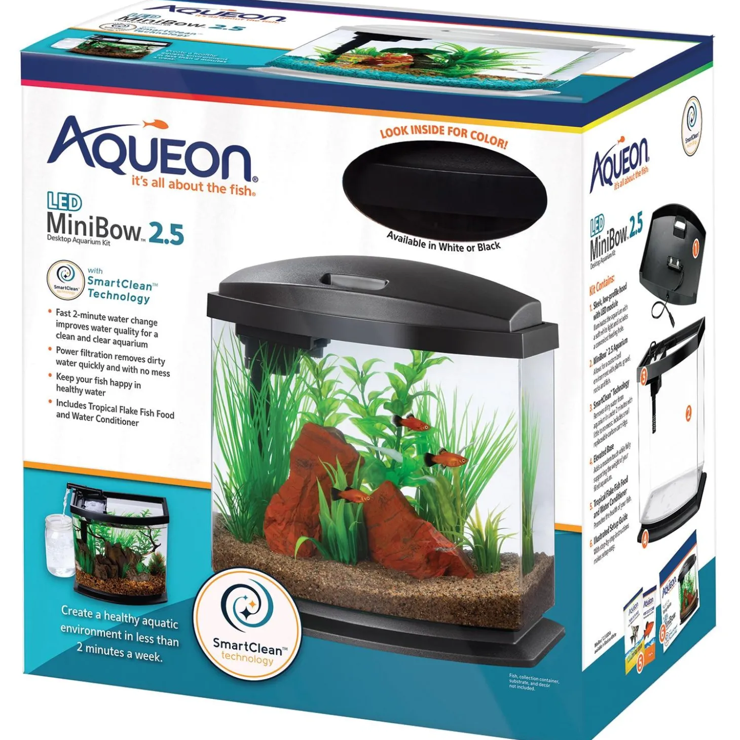 Aqueon Minibow SmartClean LED Black Kit is great for both first time and experienced fish keepers. These desktop aquariums are great for bedrooms, living rooms, home offices and more. Each kit includes a clear acrylic vessel, low-profile LED hood, elevated base, water care and food samples to get you started. Also included is a uniquely designed power filter with SmartClean Technology that makes essential water changes quick, fast and easy to do in less than 2 minutes! In just a couple minutes each week helps maintain a cleaner and healthy aquatic environment with Aqueon LED MiniBow Kits with SmartClean Technology.