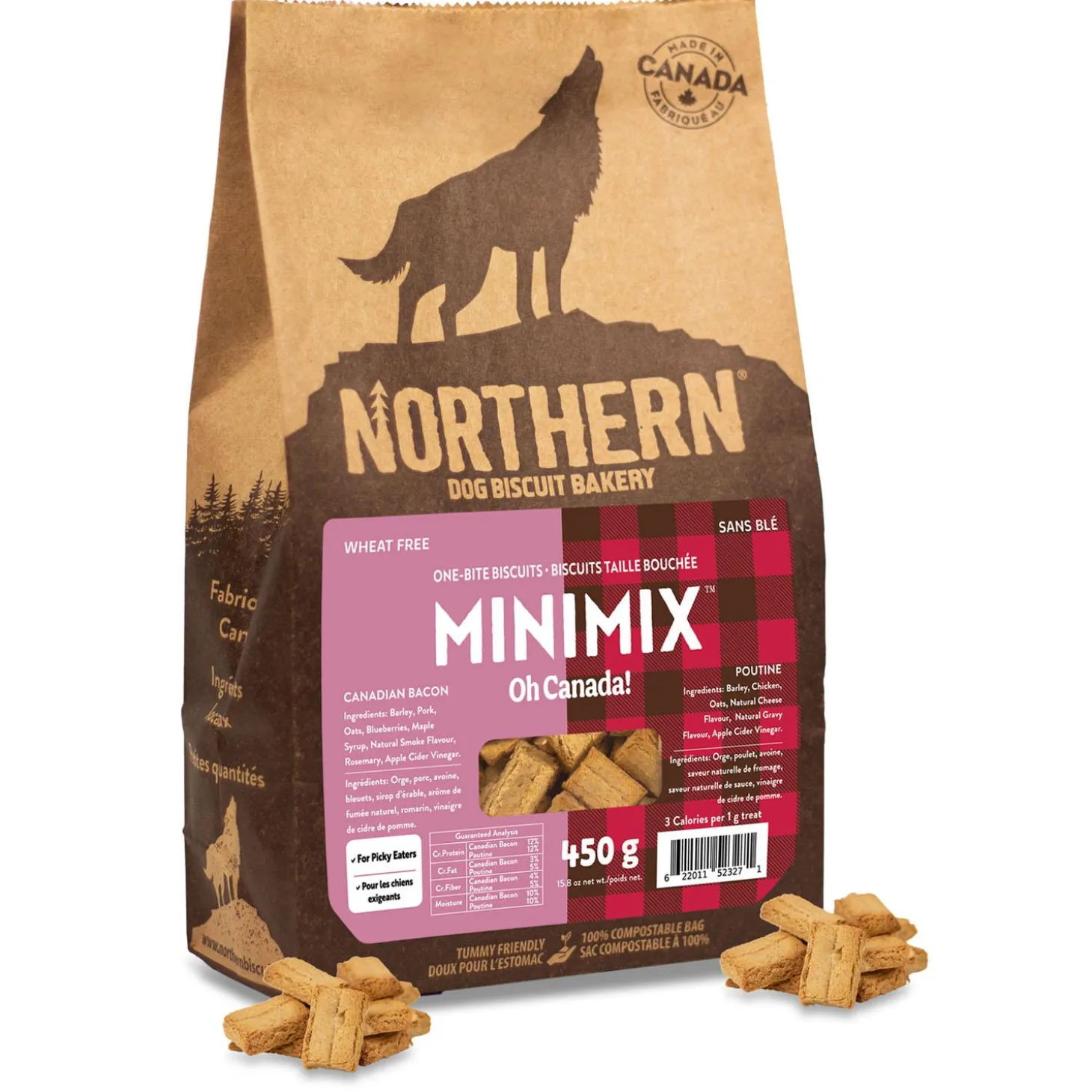 Northern Biscuit MiniMix Oh Canada! Dog Treats are a flavourful treat combining two very Canadian recipes, Canadian Bacon and Poutine, to provide a delicious surprise with every bite. Baked in small batches with limited ingredients and the specially crafted Northern CRUNCH, Northern biscuits are naturally preserved and packaged in a 100% compostable bag. A mini version of the classic Northern biscuits, these crunchy treats are great for smaller dogs with little mouths and big hearts, and make for a great training treat at only 3 calories per 1g biscuit.