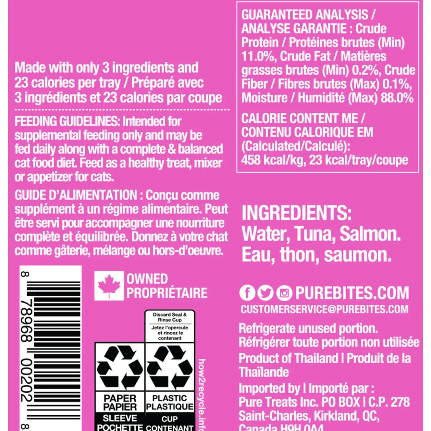 PureBites Mixers Wild Tuna & Wild Salmon Cat Treats are the ultimate limited ingredient cat treat, topper, appetizer, or mixer. Made with only 3 simple human grade ingredients: wild-caught skipjack tuna, wild-caught Alaskan salmon, and water. Nothing else. No artificial colours, fillers, sweeteners, or preservatives. PureBites Mixers are a great way to make snack time or mealtime fun and exciting, with a taste cats crave and the nutrients and hydration that pet parents love.