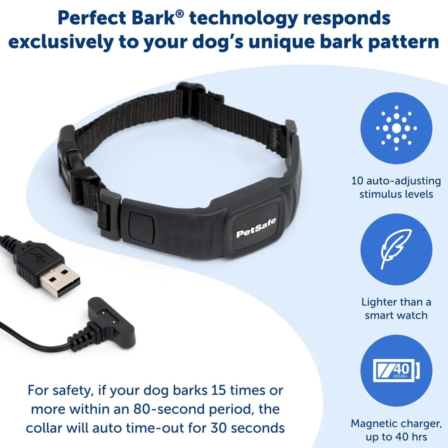 - Uses Perfect Bark tech to learn your dog’s vocal pattern and automatically adjusts its stimulus correction for your dog’s personality and barking habits