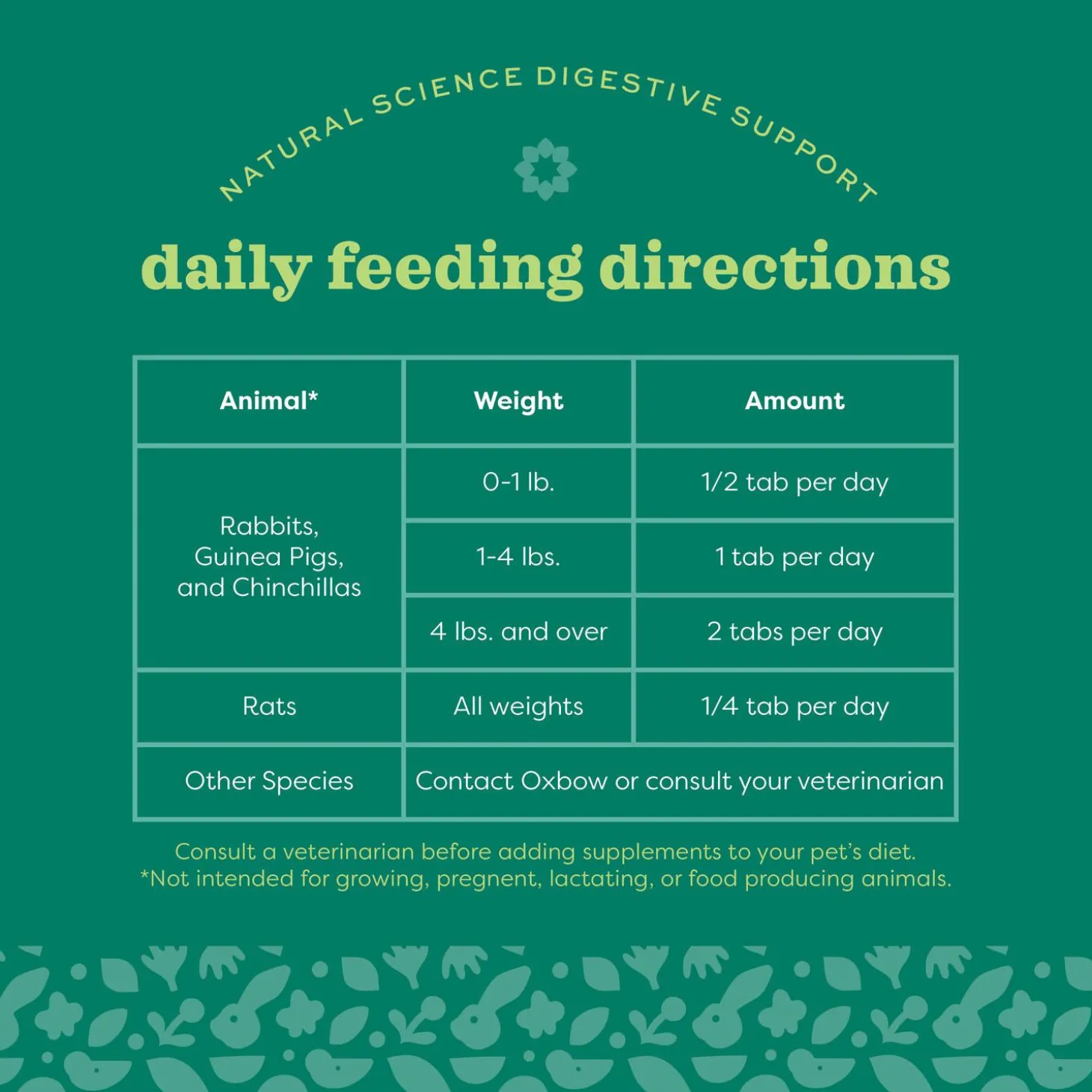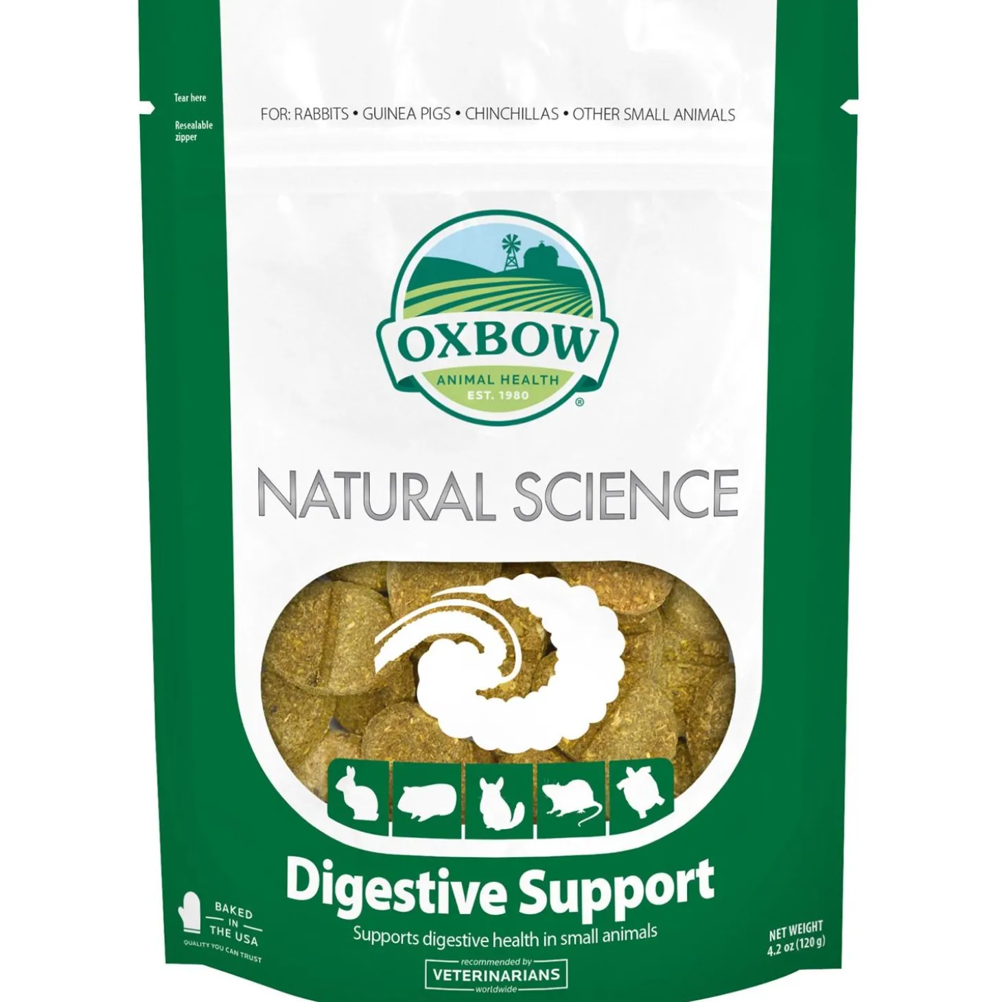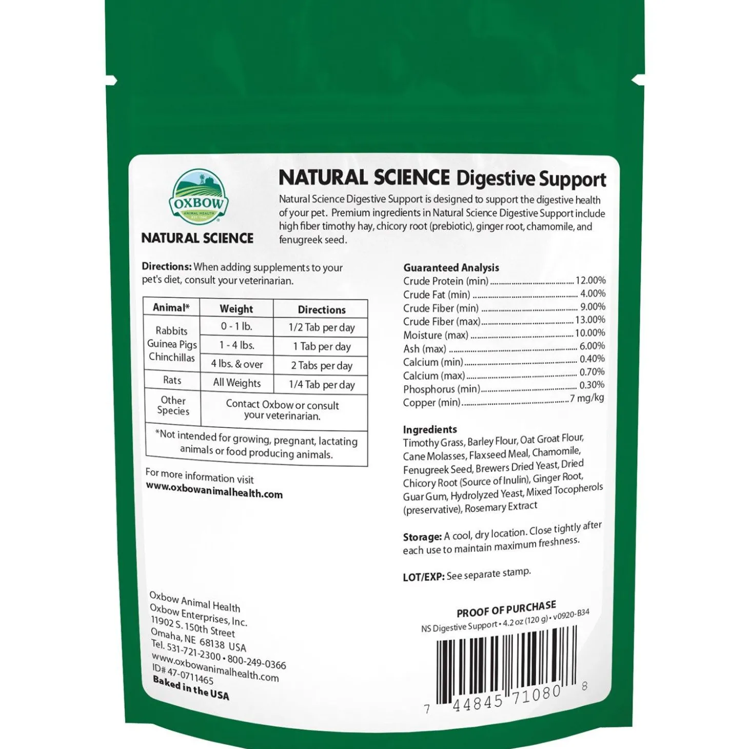 Oxbow Natural Science Digestive Support Small Animal Supplement provides high fibre support for your pet’s digestive tract. It contains high fibre Timothy hay and various herbal ingredients to support the digestive health of rabbits, guinea pigs, chinchillas, rats, and other small pets. Chicory root supports the growth of beneficial bacteria in the GI tract while Ginger Root supports gastric motility.