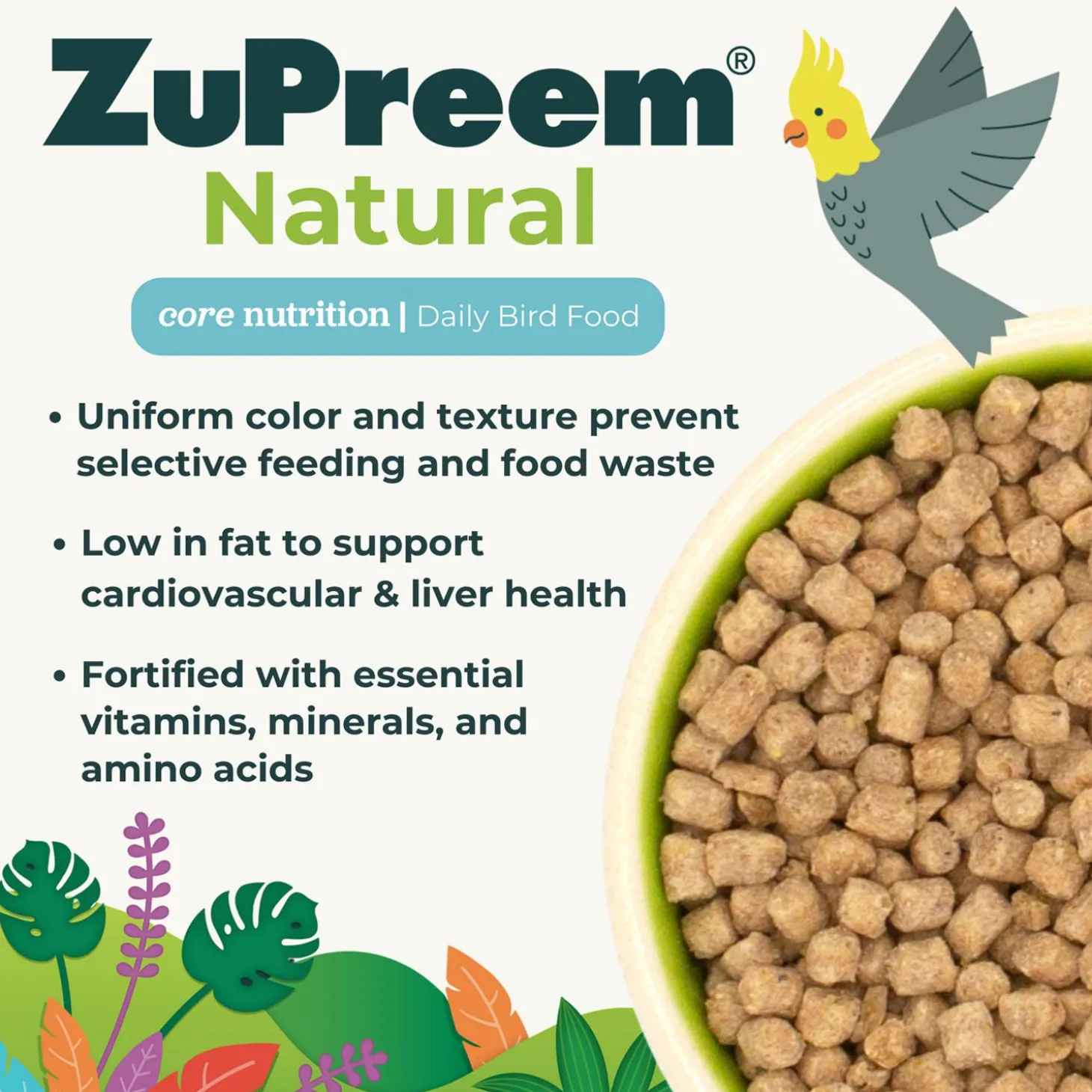 ZuPreem Natural with Added Vitamins, Minerals and Amino Acids Small Bird Food provides healthy and delicious nutrition for everyday feeding. ZuPreem Natural includes wholesome nutrition – Celery, Carrots, Parsley, Beets, Blueberries, Cranberries, and Ground flaxseeds in each delicious pellet. ZuPreem Natural diets are made with a consistent pellet colour and shape to help keep your bird from selecting specific pellets in the food cup.