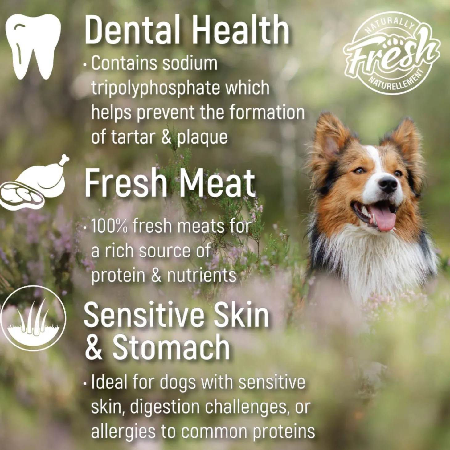 Wholesome Blend Naturally Fresh Sensitive Skin & Stomach Turkey & Rabbit Recipe Adult Dog Food is ideal for dogs with sensitive skin, digestive issues, or allergies to common proteins. This tasty recipe is made with Canadian turkey and rabbit and includes additional support for dental and oral health. This diet provides high quality nutrition for your dog that uses only the best fresh ingredients including 100% non-rendered meats. Each formula is complete and balanced by the team of companion animal nutritionists to aid in your pet’s overall health.