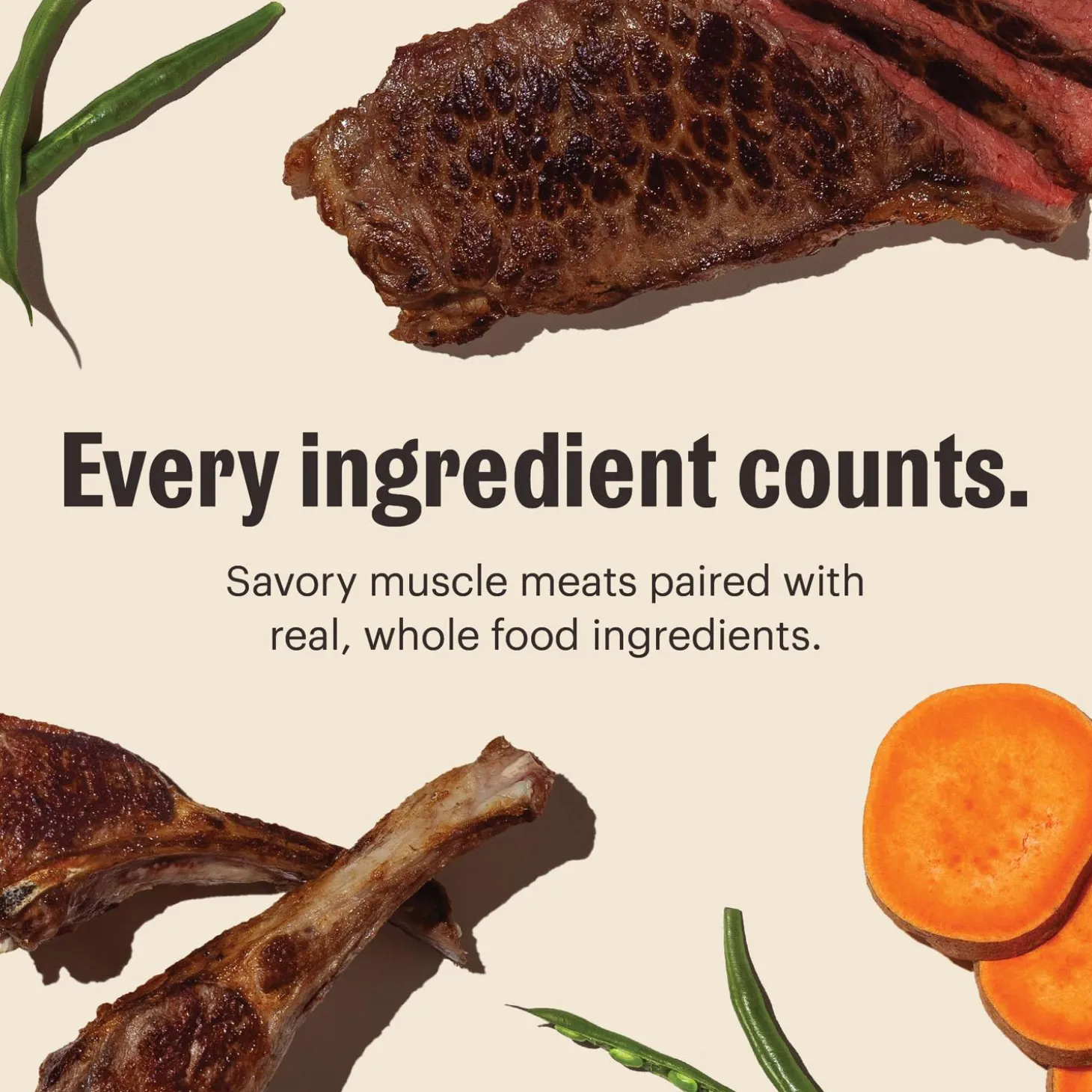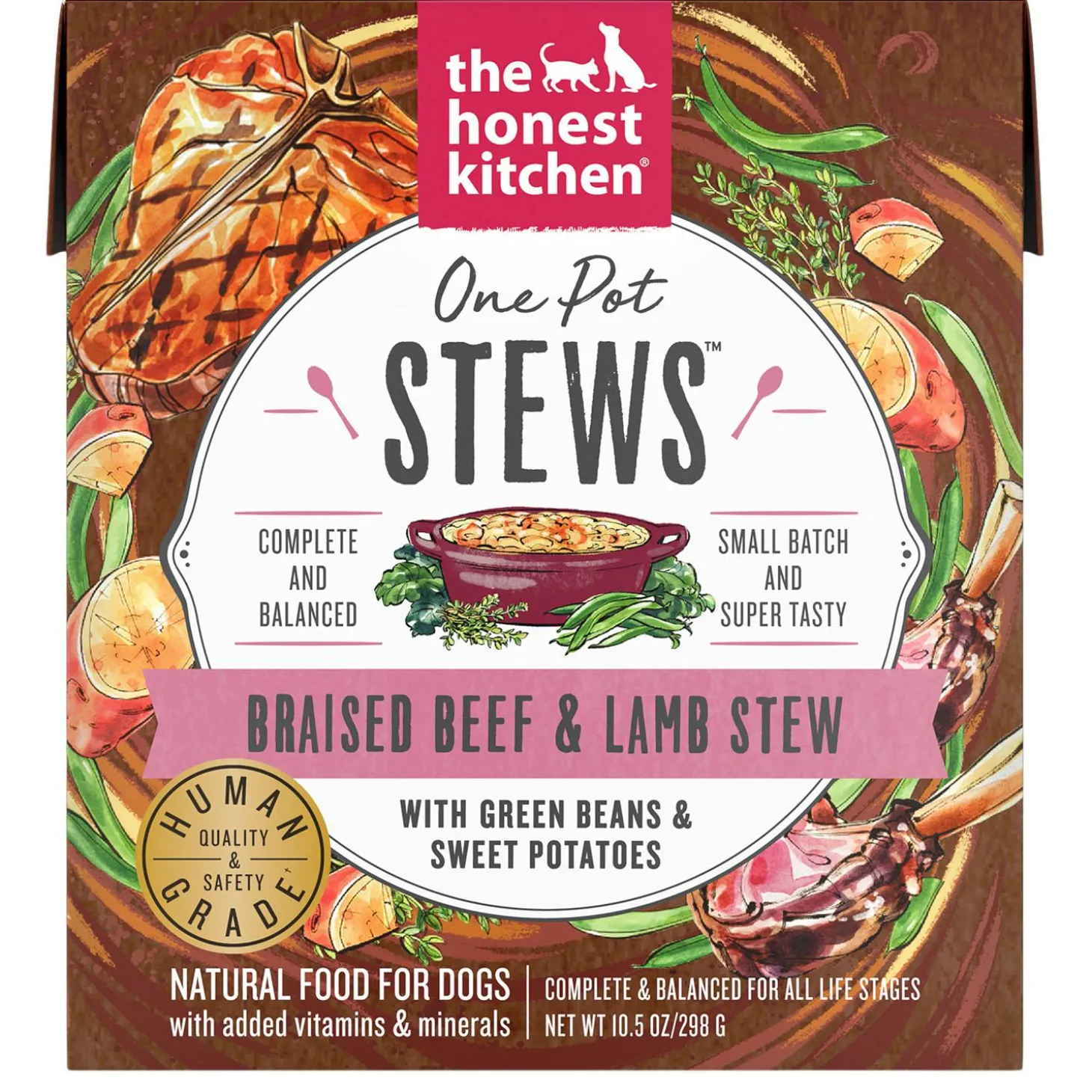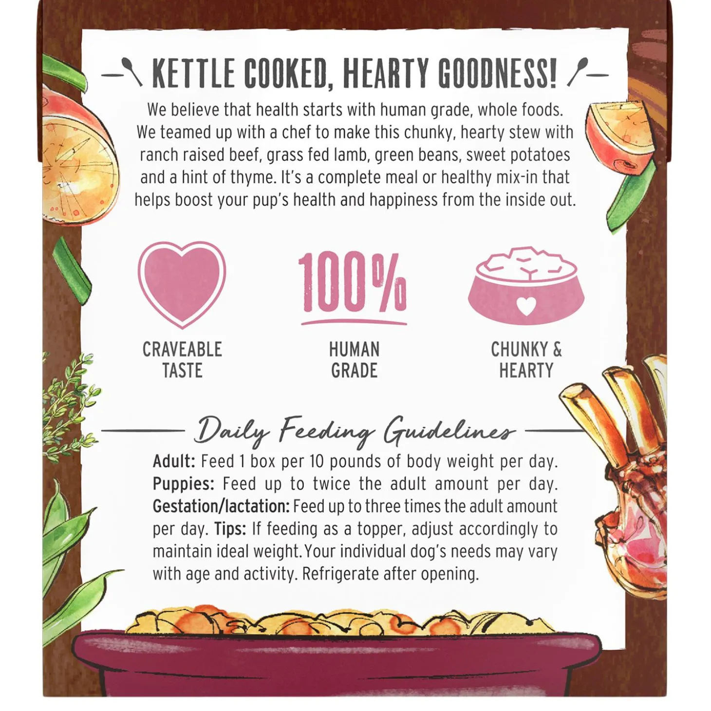 One Pot Stews Braised Beef & Lamb Stew Dog Food is kettle-cooked in small batches for a hearty, chunky texture in a bone broth reduction. It serves as a complete meal or healthy topper to dogs of all life stages, breeds and sizes including adults, puppies and gestation.