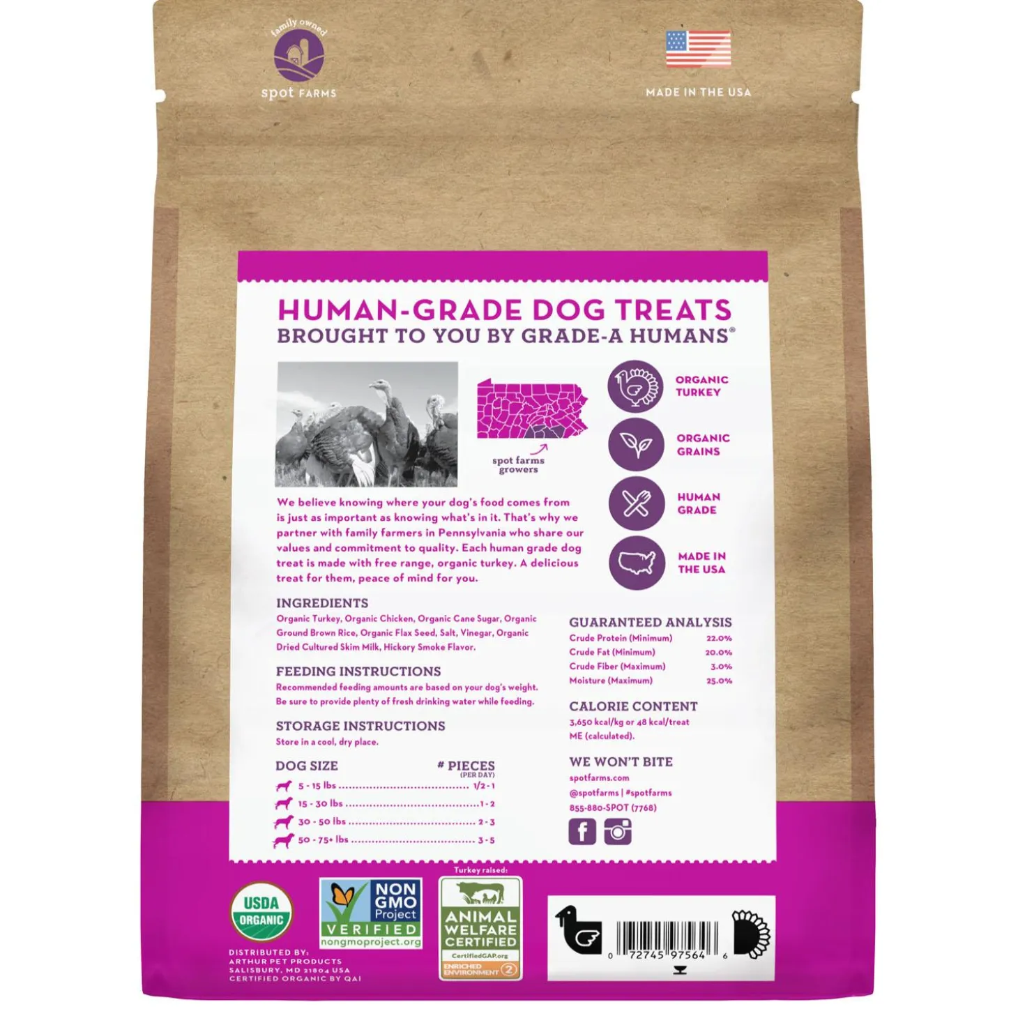 Spot Farms Organic Turkey Tenders Dog Treats are made with free-range turkey, so they taste paw-some! All of the ingredients in these treats are human grade, and the treats are made to the same standards required for foods for humans. Heart-healthy organic brown rice is gluten-free and has a low glycemic index, paw-fect for dogs with food sensitivities. These treats have no byproducts or artificial flavours, colours or preservatives, plus they’re GMO-free.