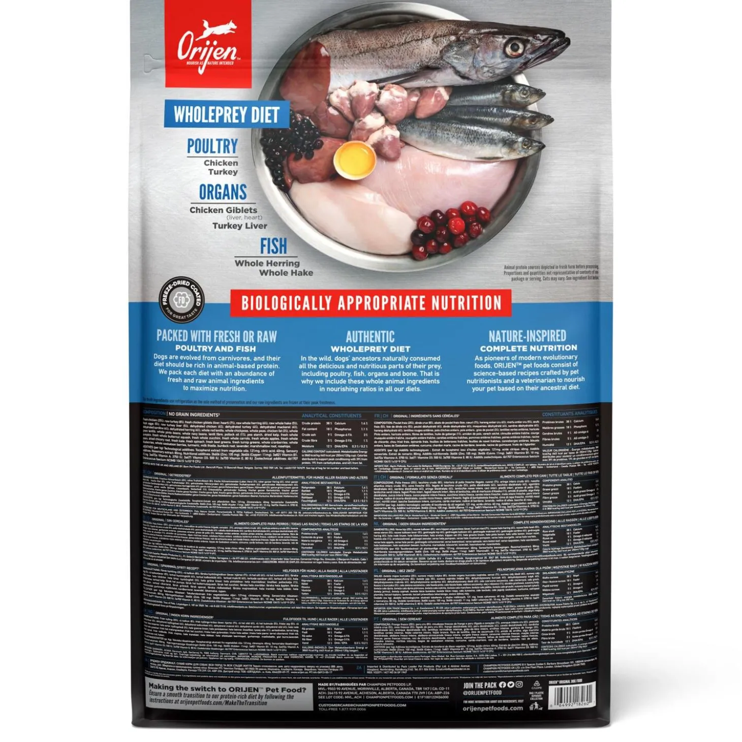 - The authentic WholePrey diet features the most succulent parts of the prey like poultry or fish, organs and bone to mimic what your dog’s ancestors consumed in the wild