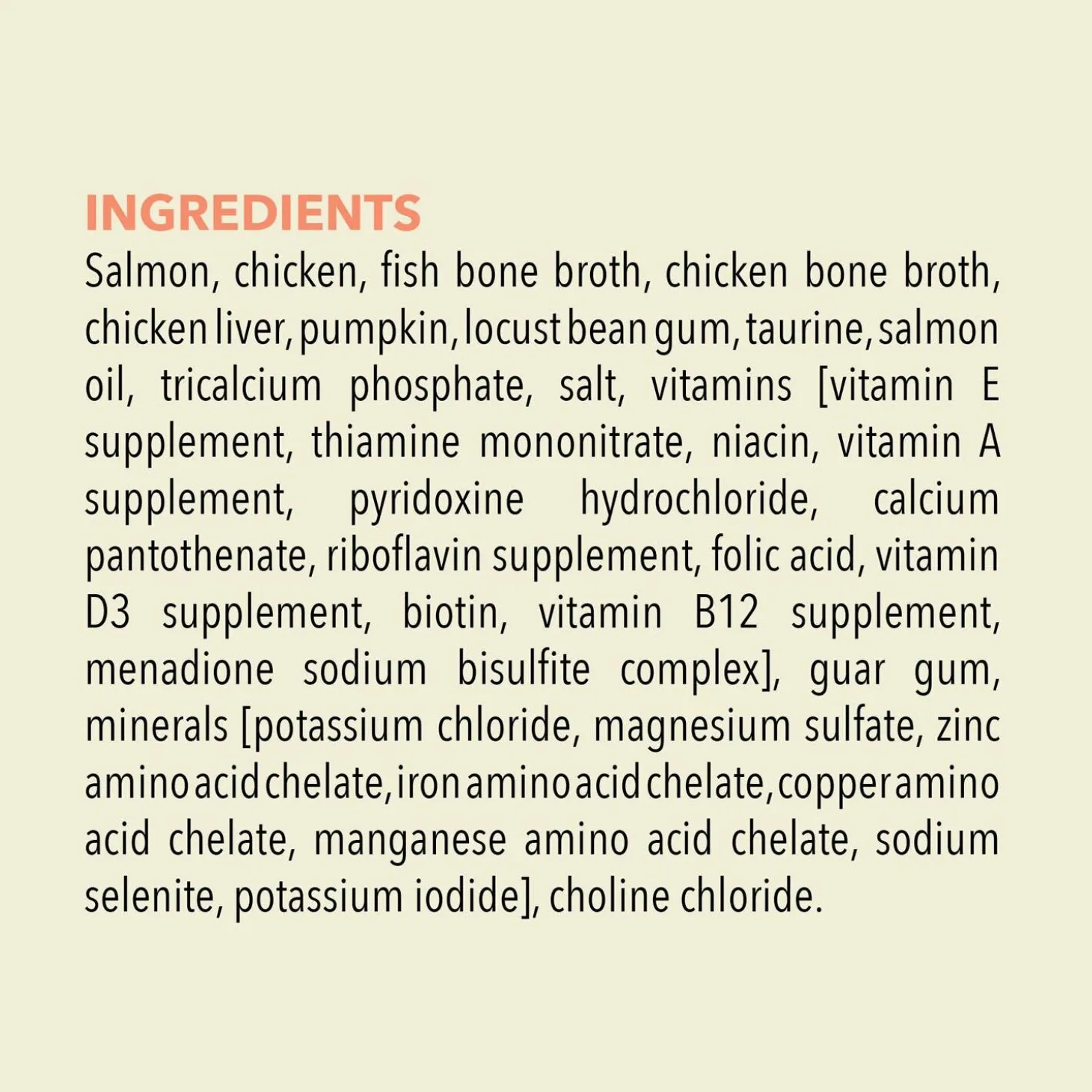 - The first 6 ingredients are raw salmon, chicken, fish bone broth, chicken bone broth and chicken liver.