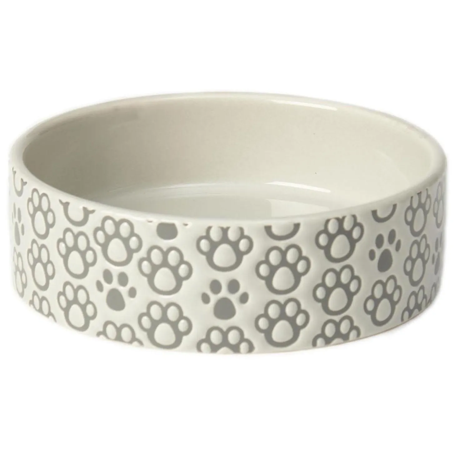 PetRageous Paws Shallow Stoneware Round Bowl is perfect for extra small dogs or cats. Crafted from 100% ceramic stoneware, the gray exterior features embossed paw designs and a dark gray paw print in the basin.