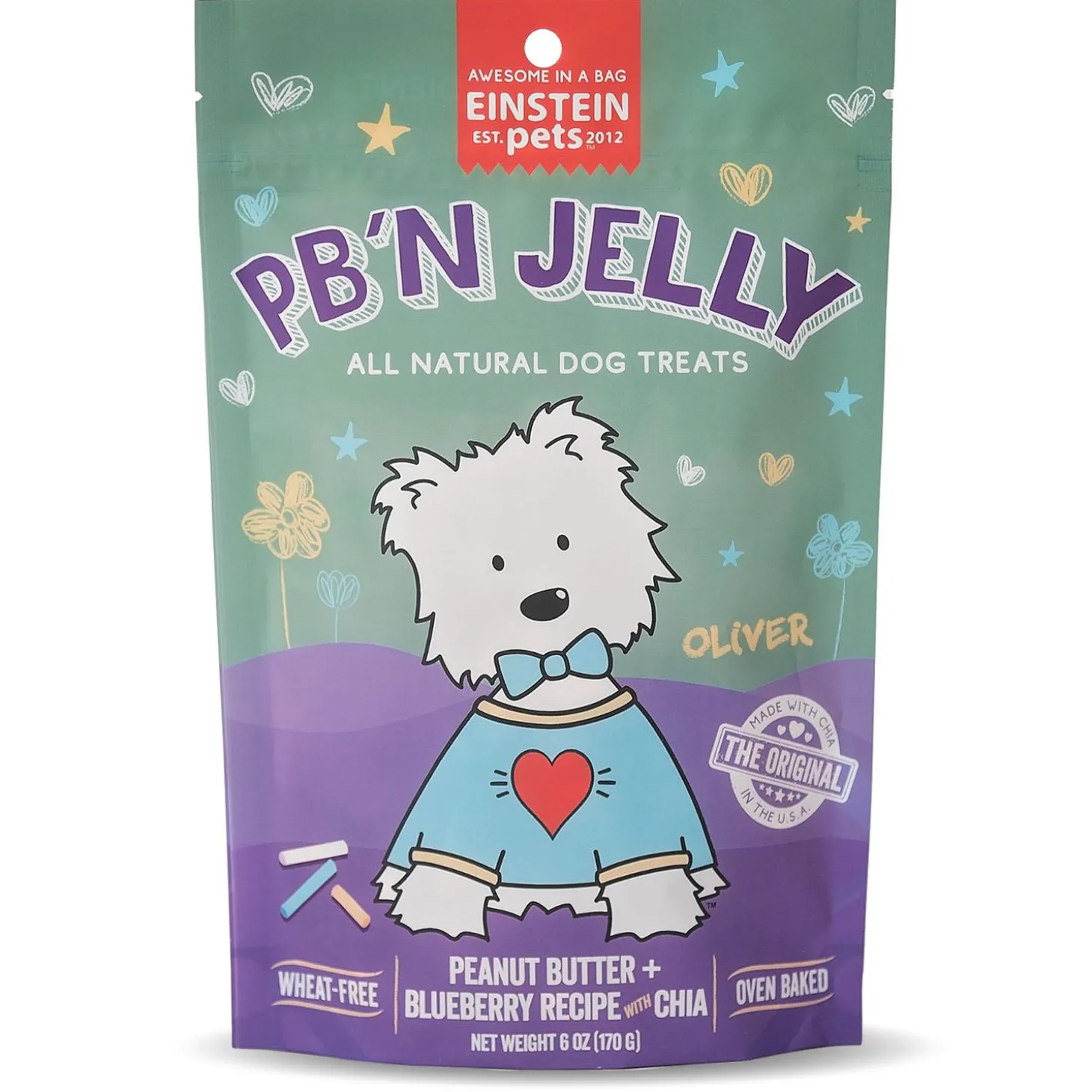 Einstein Pets PB’N Jelly Peanut Butter + Blueberry with Chia Recipe Dog Treats are made with only 4 ingredients! These dog treats are made in small batches, natural and made with plant based ingredients like peanut butter, blueberries and rolled oats. Crafted in small batches in the USA, these dog-friendly snacks are a peanut butter lover’s dream come true!