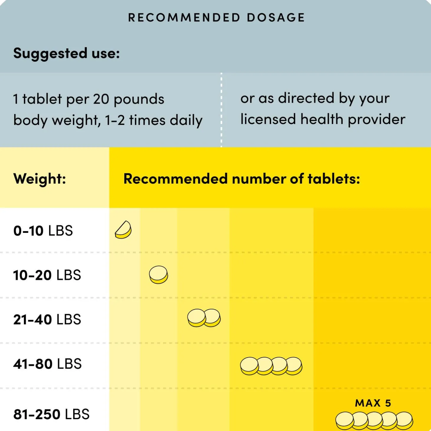 Use: 1 tablet per 9kg (20lb) body weight, 1-2 times daily, mixed with food, or as directed by your licensed health provider.