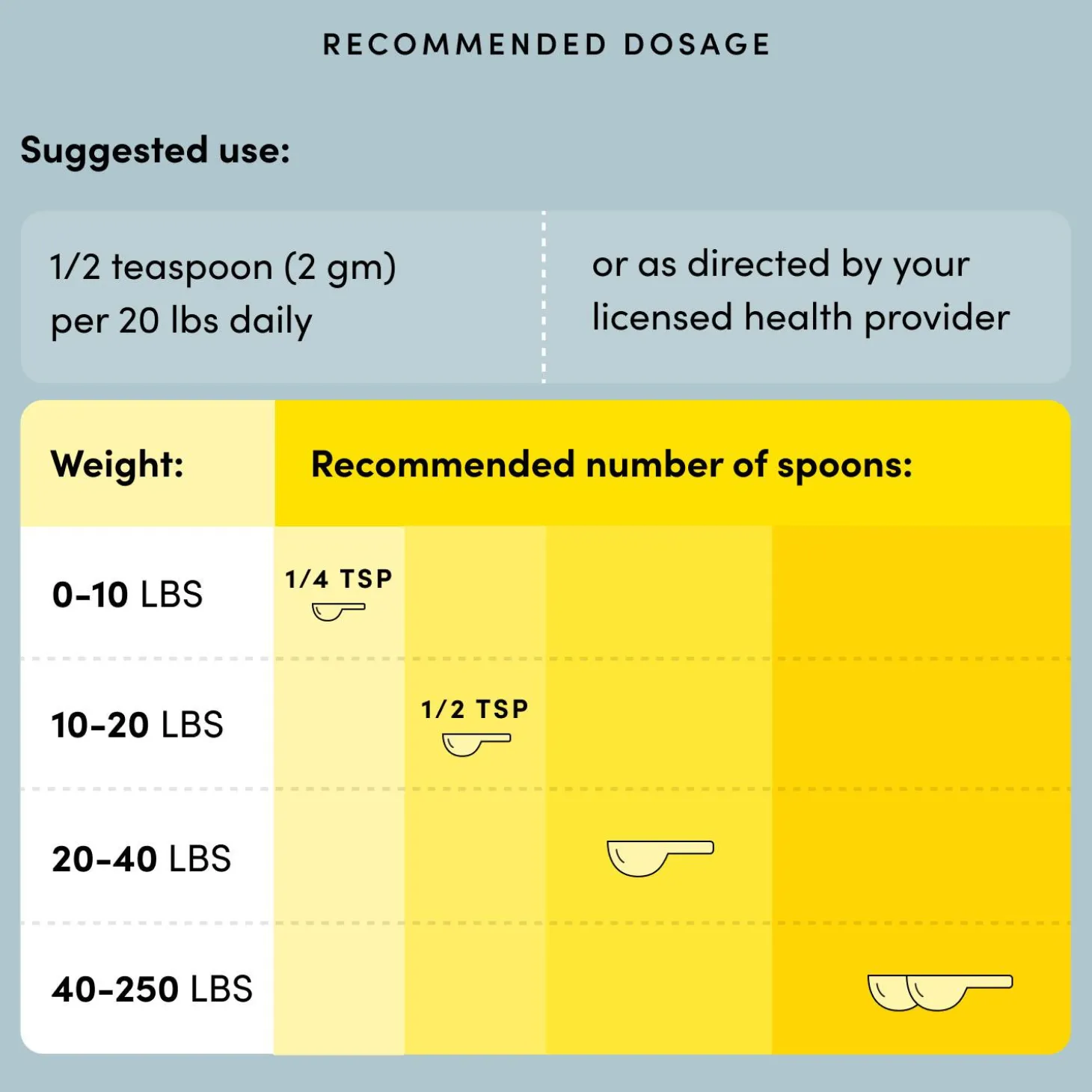 Use: Mix with food. Introduce gradually over a two week period to a concentrated dose of 1/2 teaspoon daily per 9kg (20lb) body weight.