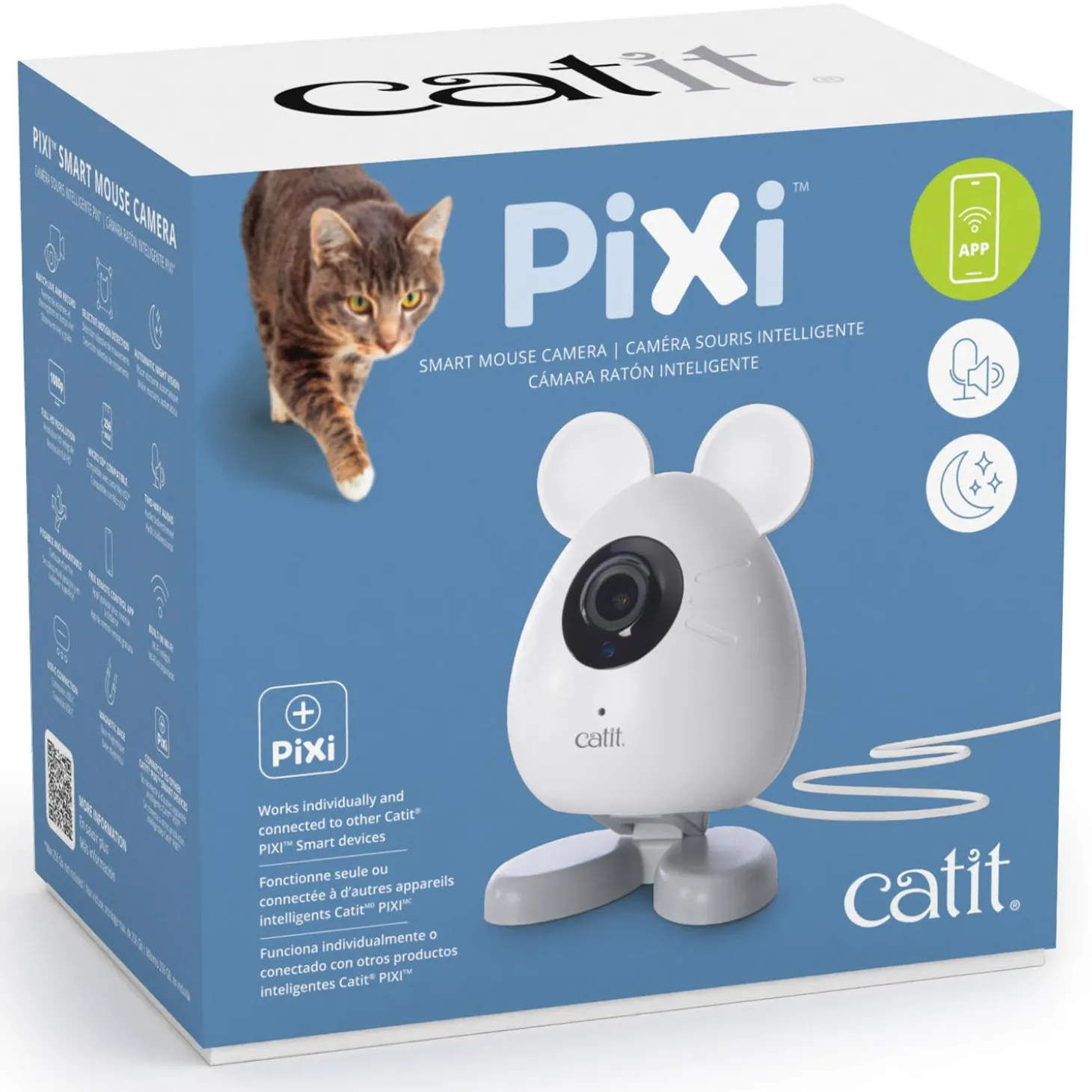 Catit PIXI Smart Mouse Camera enables you to easily check in on your cat, and even talk and listen to them when you’re away from home. This cute mouse-shaped device is equipped with a 1080p HD camera with automatic infrared night vision, built-in mic and speaker for two-way communication, as well as motion detection, so you can rest assured not a moment will be missed