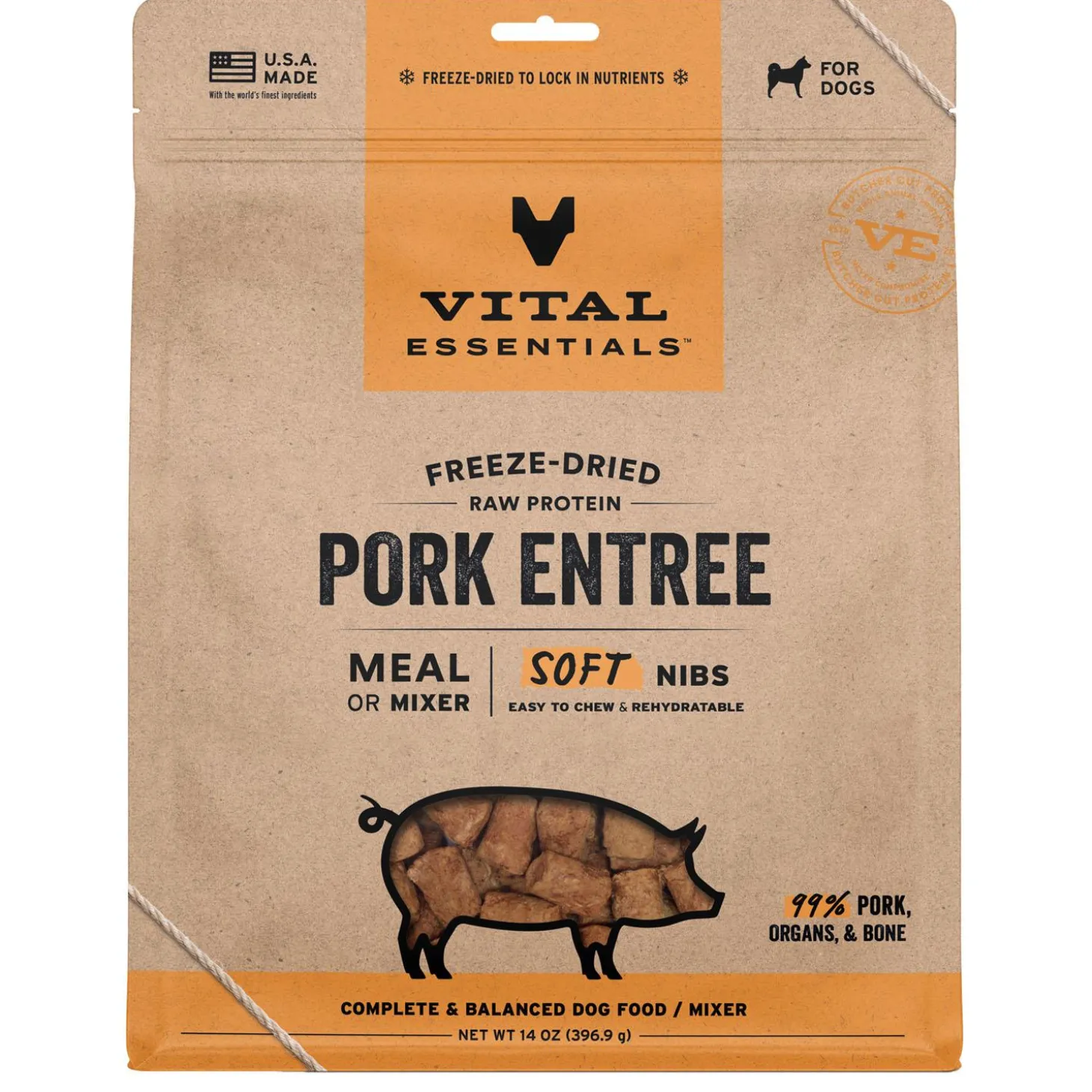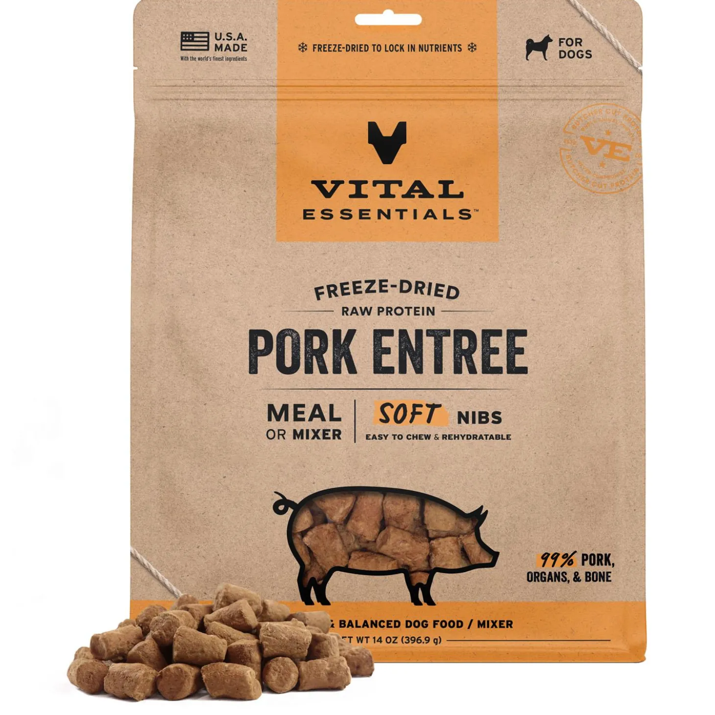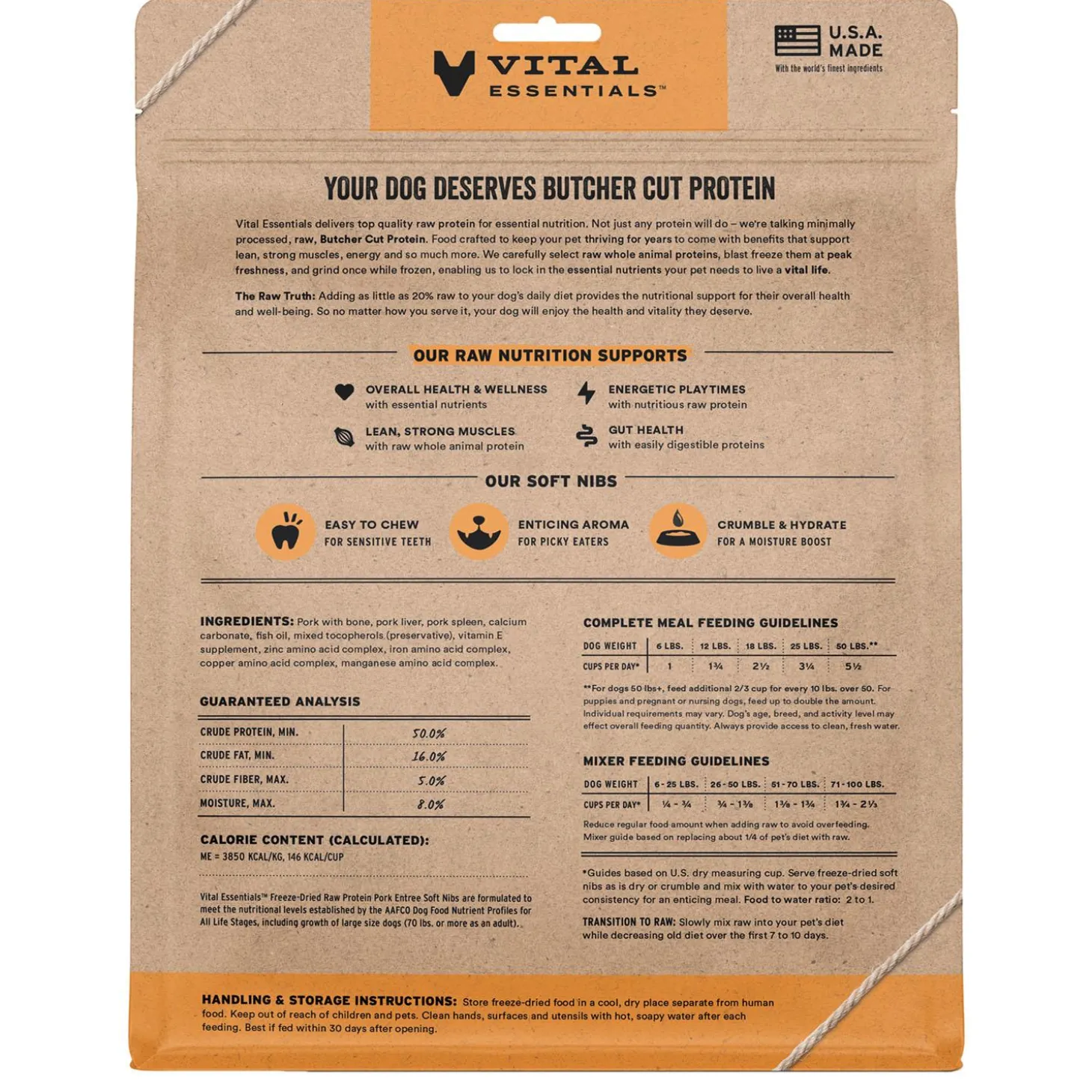 Vital Essentials Pork Entree Soft Nibs Dog Food knows that when it comes to feeding your dog a raw diet, butcher cut protein provides superior benefits. These freeze-dried raw soft nibs are the best way to pack tons of responsibly sourced and humanely harvested whole animal protein into every bite, making feeding a raw diet at mealtimes a breeze. The naturally occurring vitamins and minerals found in butcher cut protein builds strong muscles for more play, naturally supports digestive and oral health, and provides essential nutrients for dogs to look and feel their best.