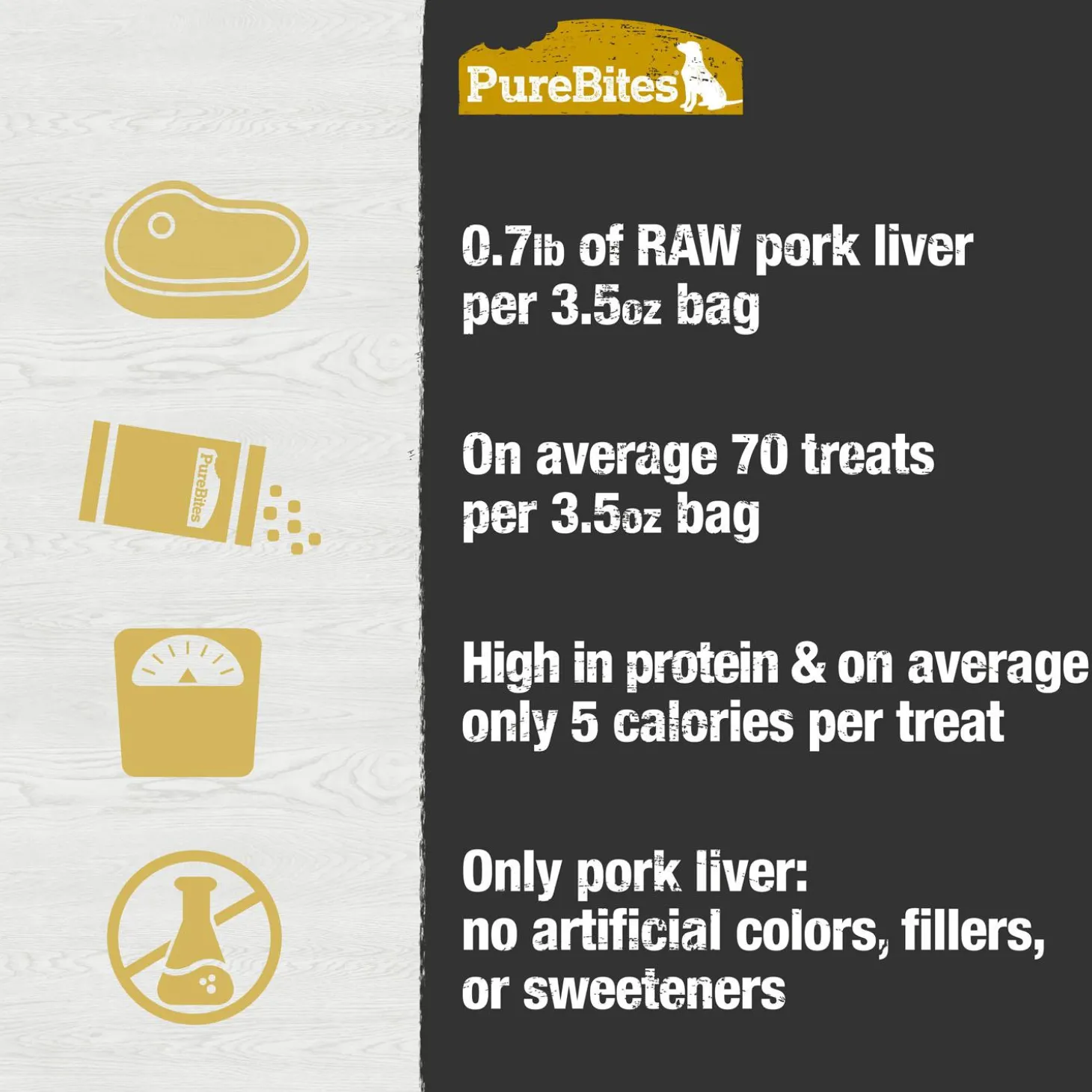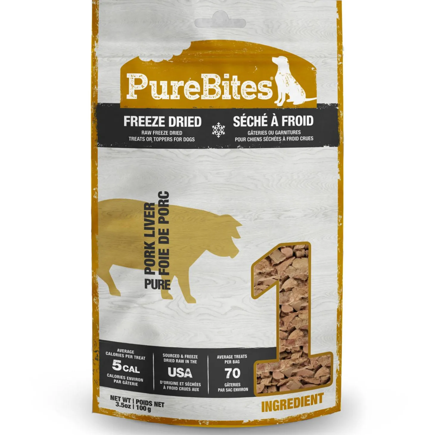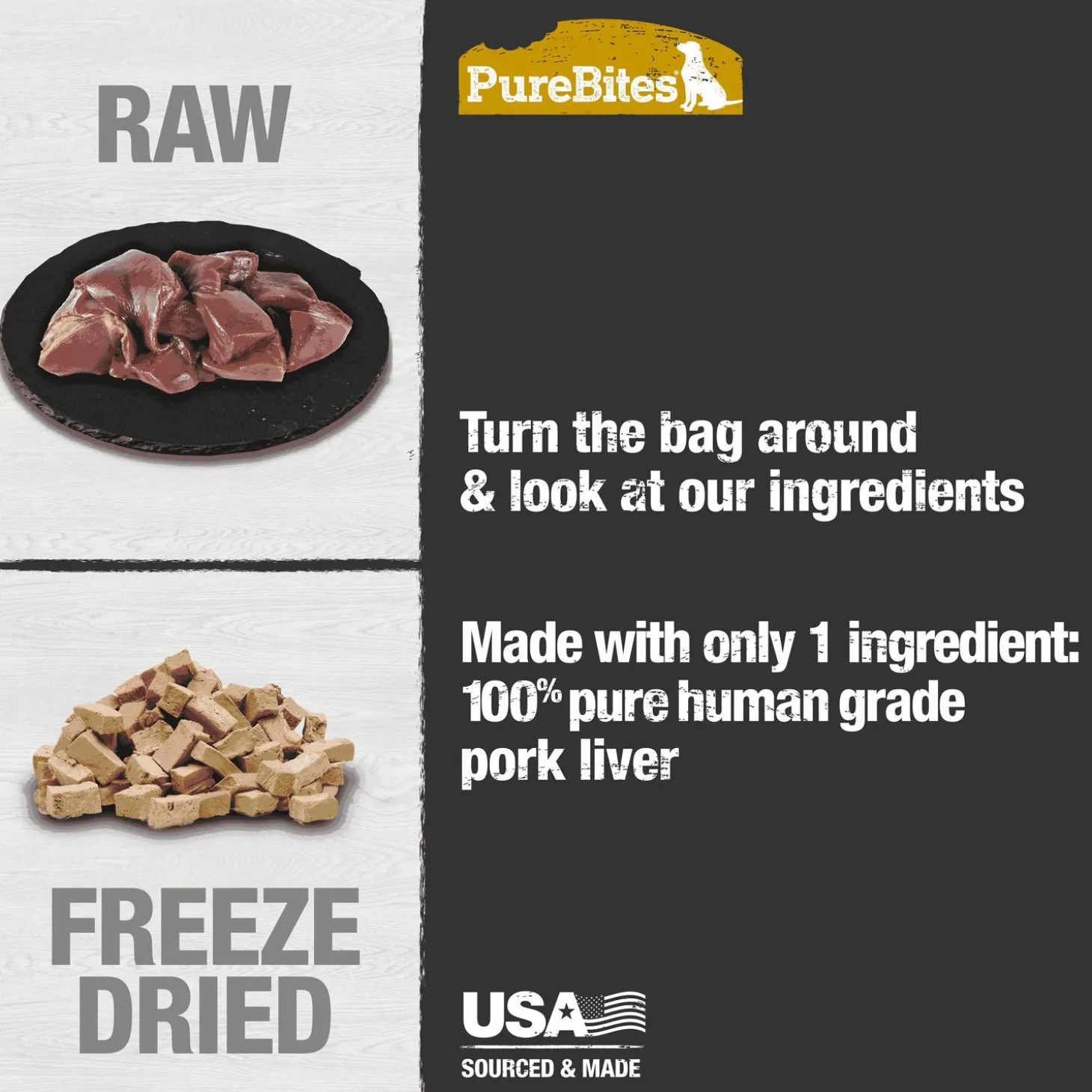 PureBites Pork Liver Dog Treats are the ultimate high-value limited ingredient treat or topper. Made with only 1 simple human grade ingredient you can read, pronounce, and trust: 100% pure USA pork liver. Nothing else. No artificial colours, fillers, or sweeteners. Proudly sourced and made in the USA using a delicate freeze drying process that helps preserve fresh raw whole food, locking in the taste dogs crave and high protein, low calorie nutrition that pet parents love. Freeze dried treats are a great compliment to a raw diet since they retain many of the benefits of raw without the hassle of refrigeration. PureBites is a proudly Canadian company treating and feeding pets from coast to coast since 2005.