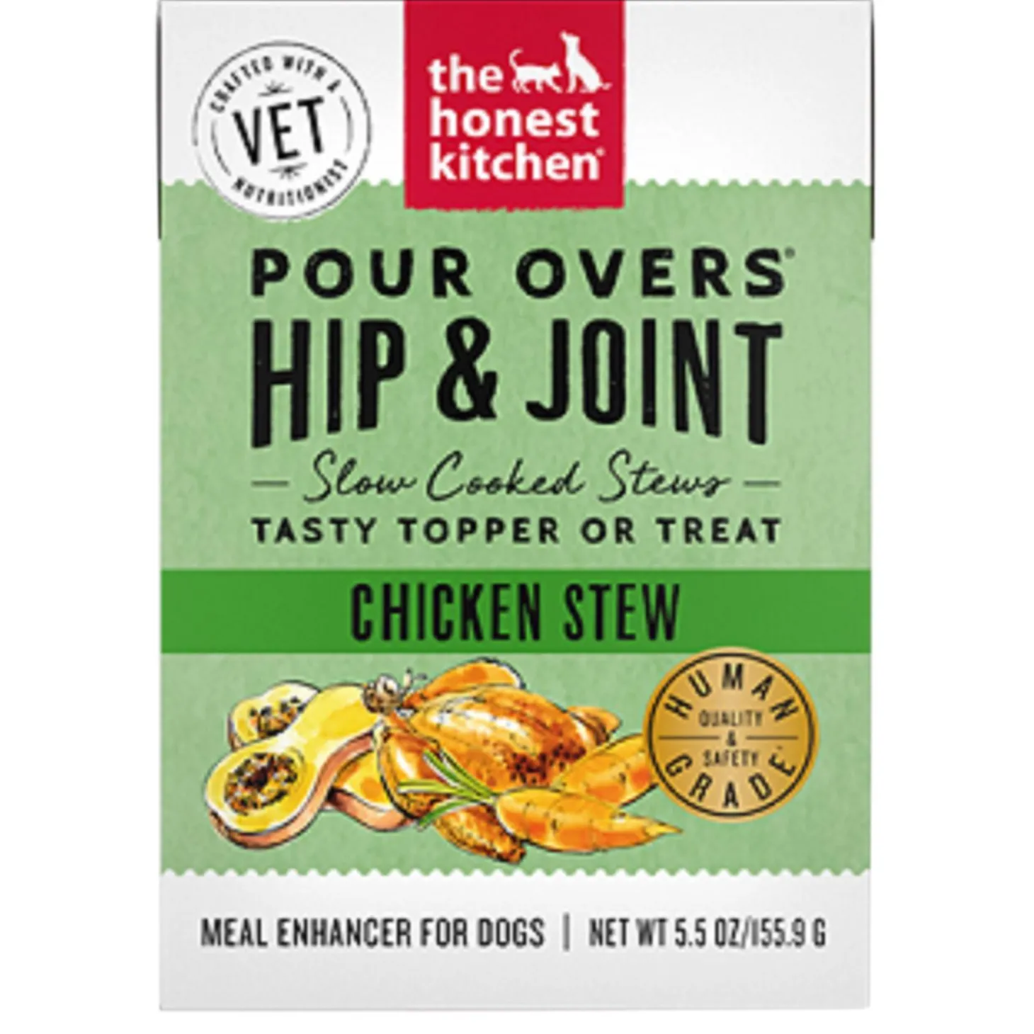The Honest Kitchen Pour Overs Hip & Joint Chicken Stew Dog Food Topper is a human grade, tasty pourable stew full of cage free chicken simmered in a bone broth reduction that boost your pup’s bowl with an extra helping of EPA and DHA to help support joint health. With just a few ingredients and an easy-to-use box, you can easily boost their bowl every day with this tasty meal topper.