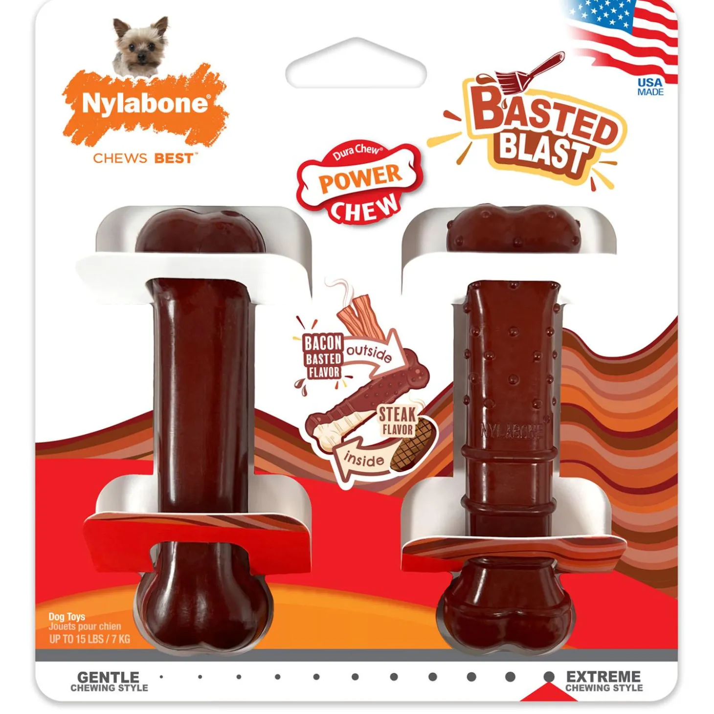 Nylabone Power Chew Bacon Basted Flavour & Steak Flavour Dog Toy surprises dogs with 2 layers of indulgent flavour in 1 long-lasting bone. Nylabone starts with a steak-flavoured chew toy and use the exclusive basting technique to add an enticing layer of bacon flavour on top. As your dog chews through the bacon-flavoured layer, the lighter colour inside will be revealed. This means they discovered the delicious steak flavour and can keep chewing for ongoing satisfaction. Made of tough nylon, these dual flavoured dog chew toys stand up to extreme chewers and are proudly made in the USA. Plus, this veterinarian-recommended chew toys help clean teeth as dogs chew. It’s time for your dog to taste the baste!