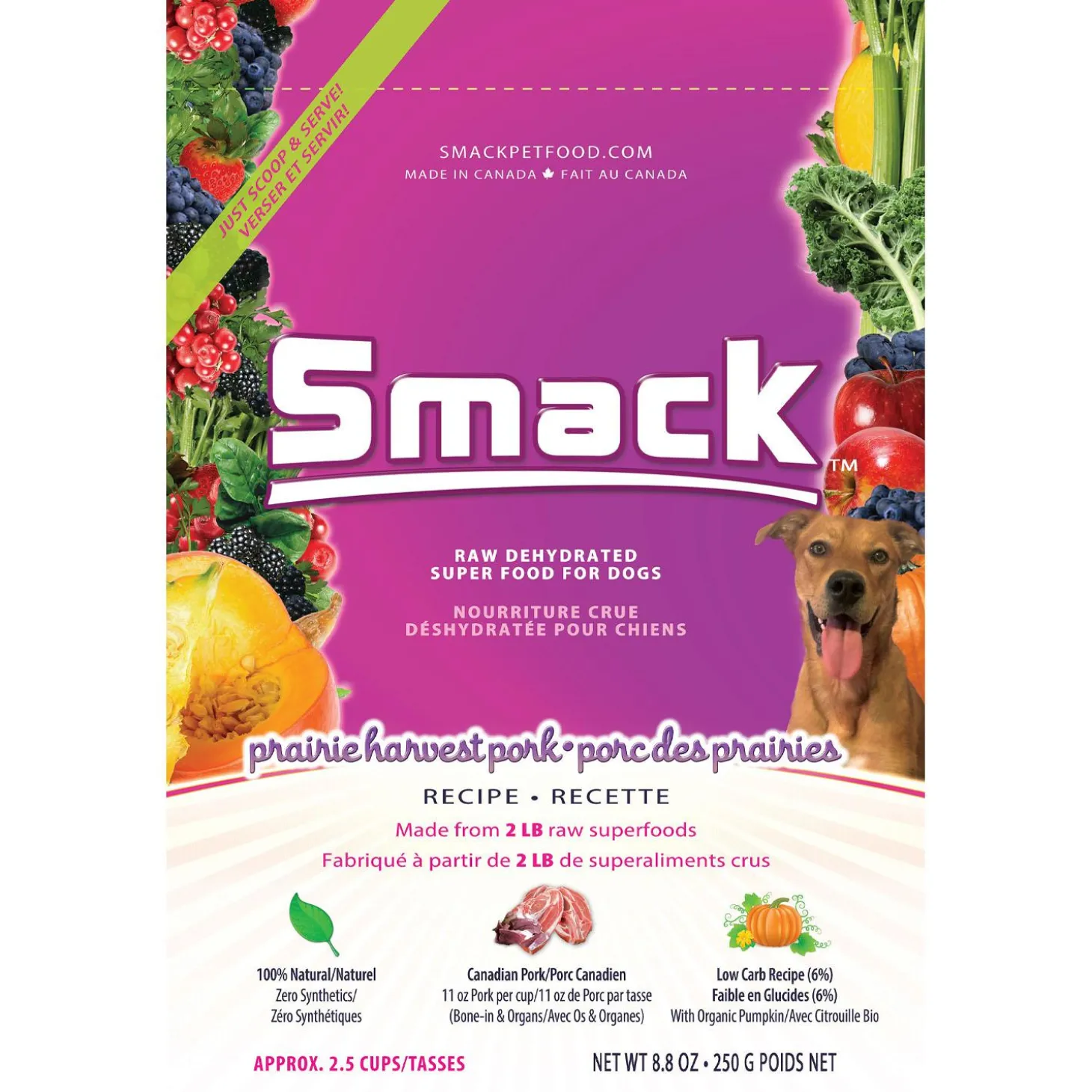 Smack Prairie Harvest Pork Recipe Dog Food is a delicious Canadian-raised, all-natural pork. It also has the perfect blend of complementary superfoods