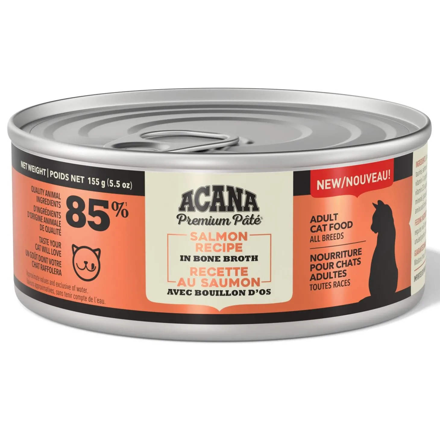ACANA Premium Pate Salmon Recipe Cat Food is specially crafted to nourish your cat with 85% quality animal ingredients. This delicious meal also includes savoury bone broth that provides the added hydration your cat needs, as well as a burst of delicious flavour in every bite. Rich with quality raw animal ingredients, this will satisfy your cat completely with the animal protein they crave.