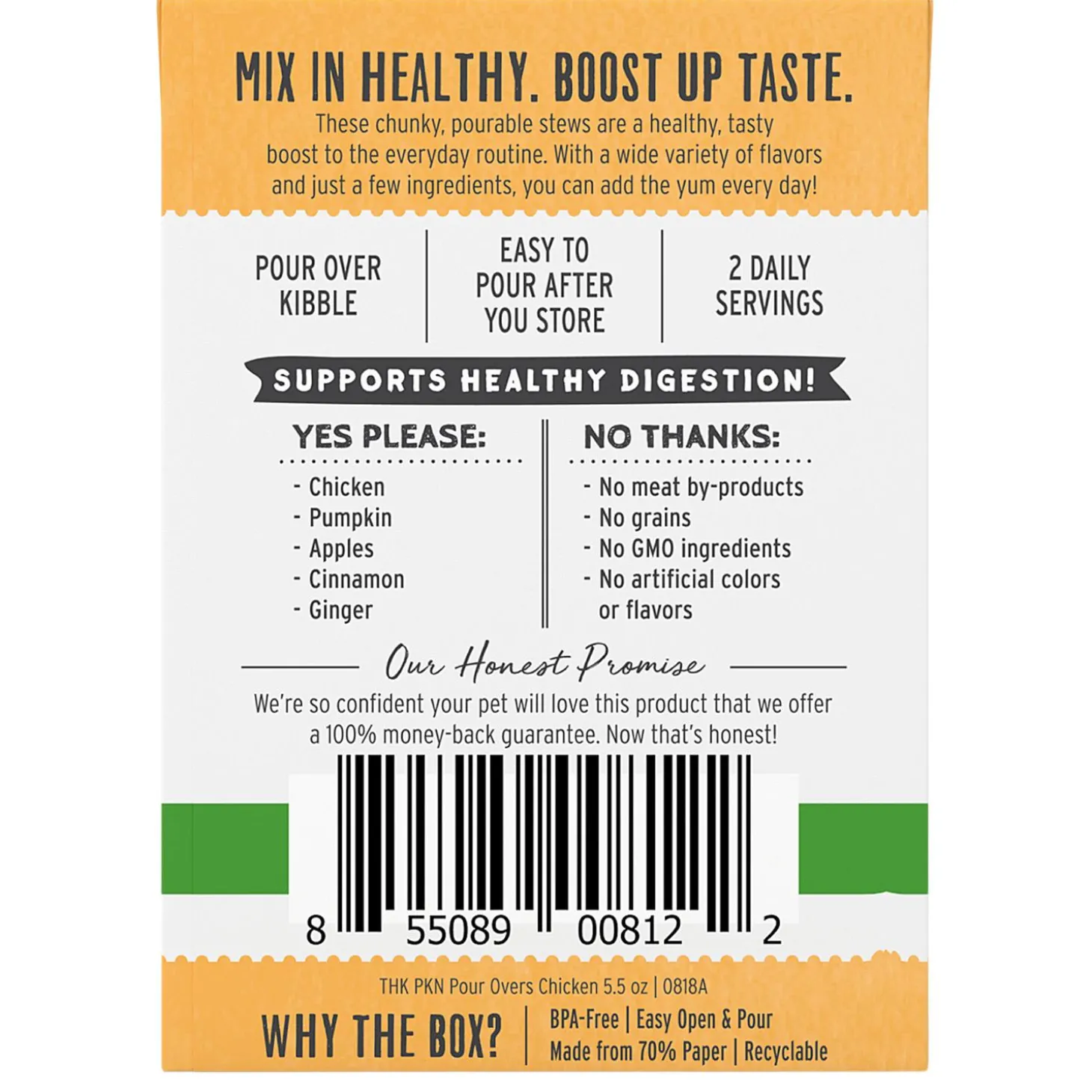 The Honest Kitchen Pumpkin Pour Overs Chicken & Pumpkin Stew Dog Food Topper boosts whatever is in your dogs bowl. With a wide variety of flavour, just a few ingredients, and an easy-to-use box, you can easily boost their bowl every day. Mix in healthy. Boost up taste.