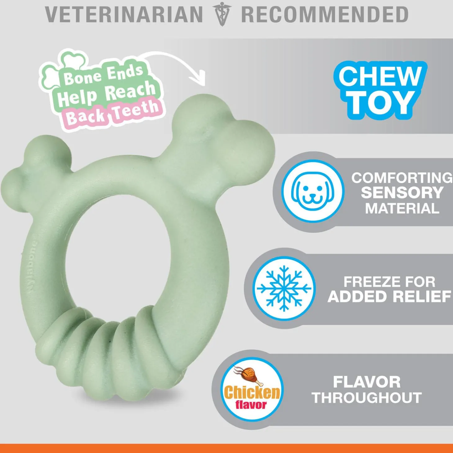 Nylabone Puppy Chew Chicken Flavour Teething Tactile Ring Dog Toy gives your pup the teething relief they need! Made from a comforting sensory material, this teething ring is gentle on puppy gums and can be frozen for an extra-soothing feel. Plus, it is uniquely designed with bone ends that are perfect for reaching back teeth. This chew toy also features delicious chicken flavour that will keep your pup coming back for more fun. Teach your best friend positive chewing habits that will last a lifetime with this puppy chew toy!