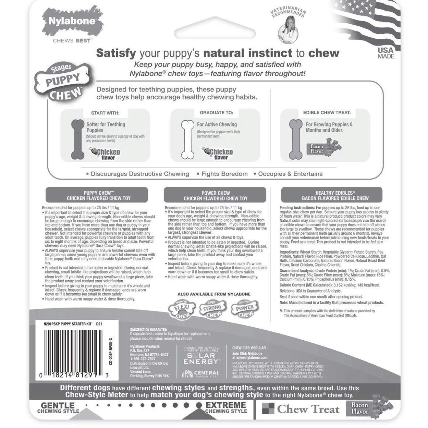 Nylabone Puppy Starter Kit Dog Chew Toys help develop healthy chewing habits from the start. This kit includes a soft plastic Puppy Chew Bone for teething puppies before they get any permanent teeth, a Power Chew chicken-flavoured bone for puppies starting to get their permanent teeth and a Healthy Edibles bacon-flavoured chew treat recommended for puppies 6 months and older. Each chew encourages proper chewing habits and helps discourage destructive chewing from a young age. Plus, they promote dental health by reducing plaque and tartar as your dog chews. You can feel good about rewarding your new best fur friend with these veterinarian- recommended puppy chew toys that are proudly made in the USA!