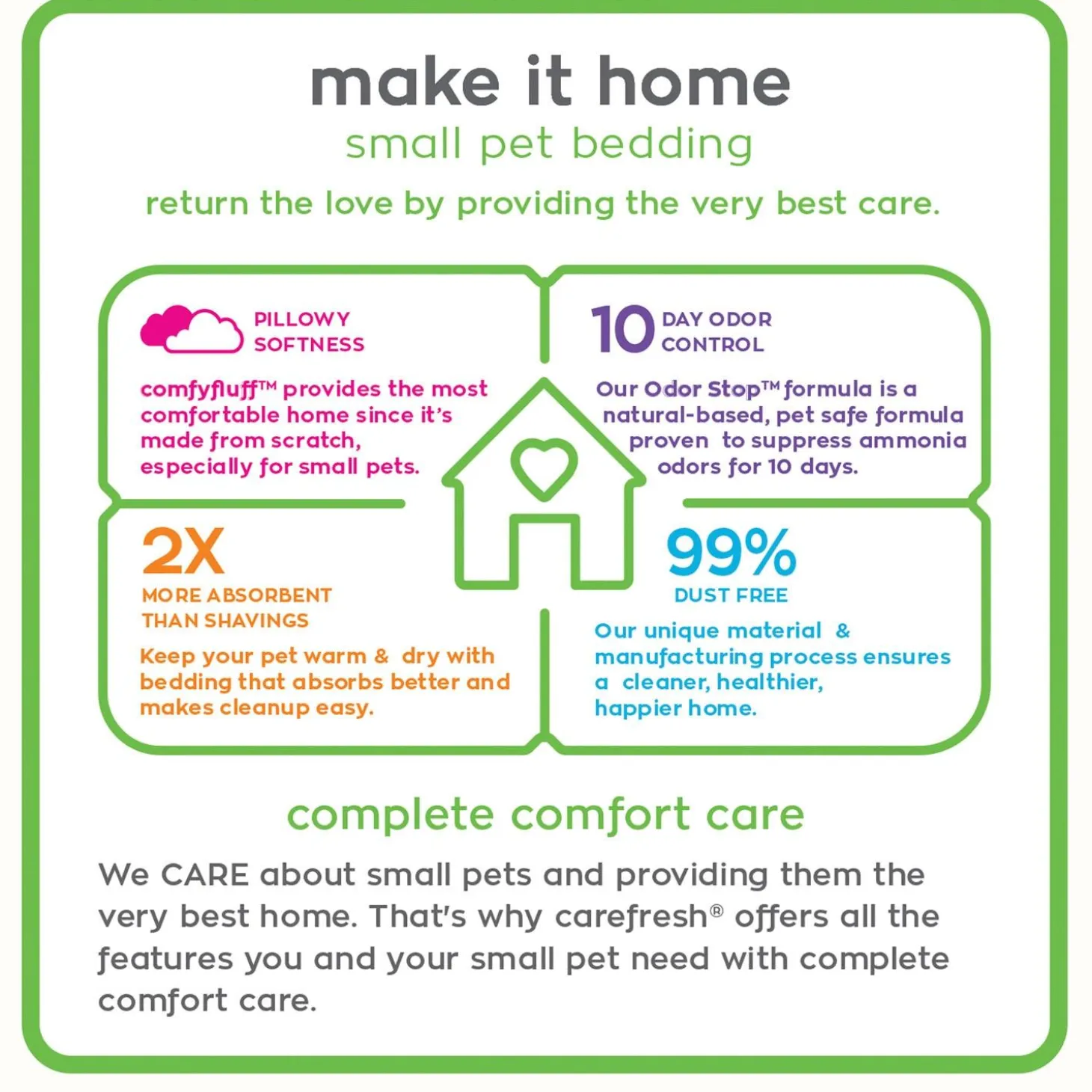 Only carefresh is made from scratch with pillowy soft, ultra absorbent comfyfluff designed specifically for small pets. Provide your small pet with a soft, safe, clean, dry home derived from 100% reclaimed natural fiber. Perfect for hamsters, gerbils, rats, mice, rabbits, guinea pigs, chinchillas, ferrets.