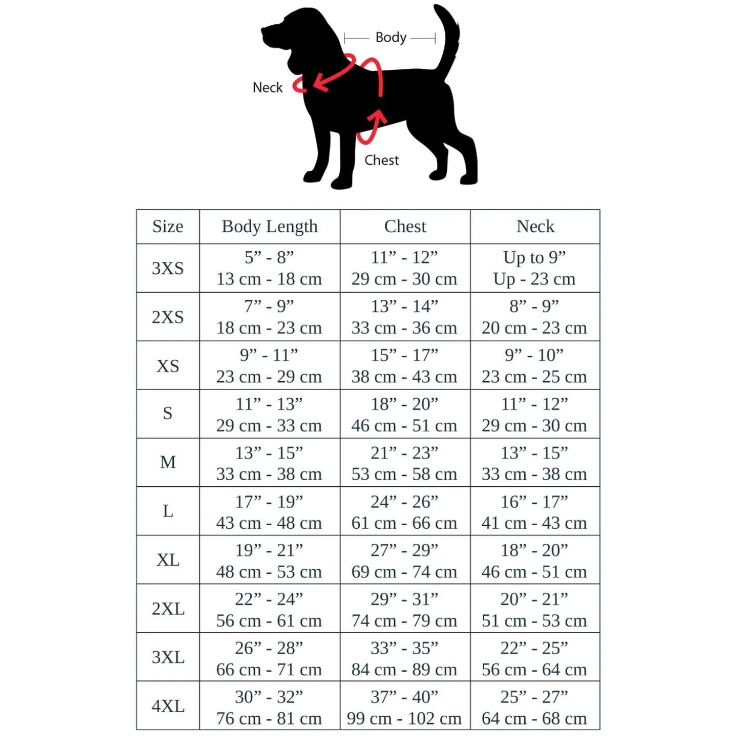| Size | Body Length | Chest | Neck |