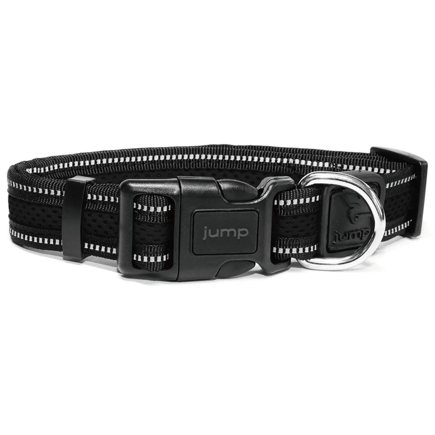 JUMP! Reflective Air Mesh Black Dog Collar is lightweight for your dog’s added comfort and redcued risk of skin irritation, especially on long walks or hikes. The lighterweight also makes it easier to put on and take off. It is adjustable to achieve a better fit for your dog, allowing two fingers to be placed between the collar and your dog. D-ring for leash attachment and reflective stitching for better visibility in low light. The air mesh provides comfort and breathability for increased airflow to keep dogs cooler in hot weather. This collar is suitable for dogs that do not have a head narrower than its neck. Not suitable for use with a tie-out.
