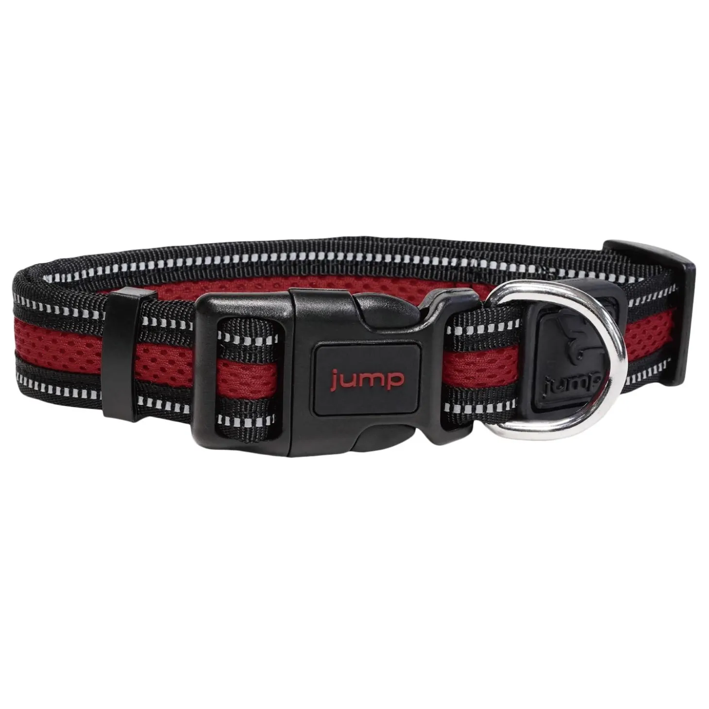 JUMP! Reflective Air Mesh Red Dog Collar is lightweight for your dog’s added comfort and redcued risk of skin irritation, especially on long walks or hikes. The lighterweight also makes it easier to put on and take off. It is adjustable to achieve a better fit for your dog, allowing two fingers to be placed between the collar and your dog. D-ring for leash attachment and reflective stitching for better visibility in low light. The air mesh provides comfort and breathability for increased airflow to keep dogs cooler in hot weather. This collar is suitable for dogs that do not have a head narrower than its neck. Not suitable for use with a tie-out.