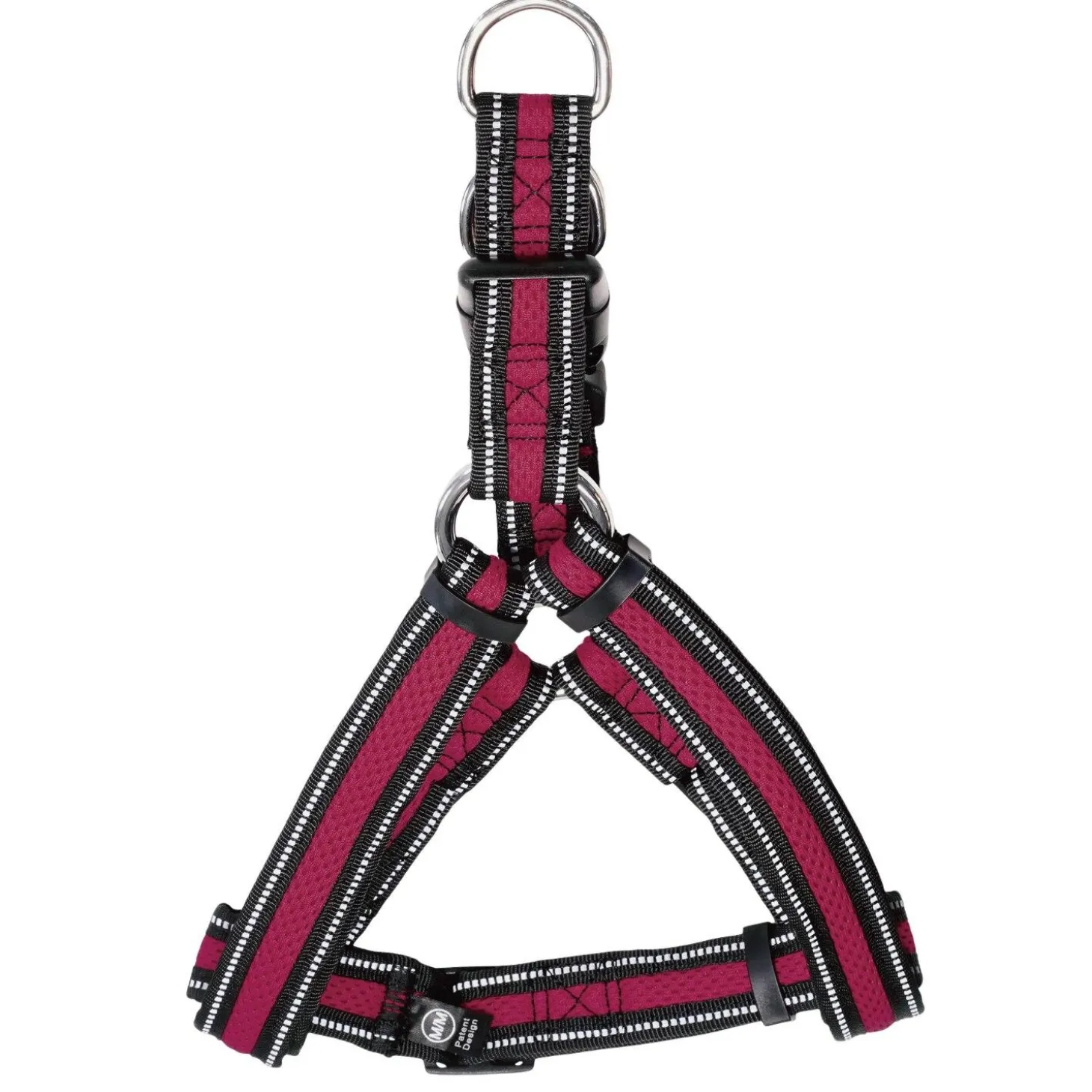 JUMP! Reflective Air Mesh Step-In Pink Dog Harness is lightweight for added comfort and reduced risk of skin irritation, and easy to put on. Simply have your dog step into each loop and secure at the back with buckle and adjust for perfect fit, leaving two-finger space between dog and harness. D-rings for leash attachment can also be found at the back with the buckle. Step-In harnesses distribute pressure more evenly across the check and front legs thus reducing pressure on a dog’s neck. The air mesh provides comfort and breathability for increased airflow to keep dogs cooler in hot weather and reflective stitching provides for better visibility in low light. Not suitable for use with a tie-out.