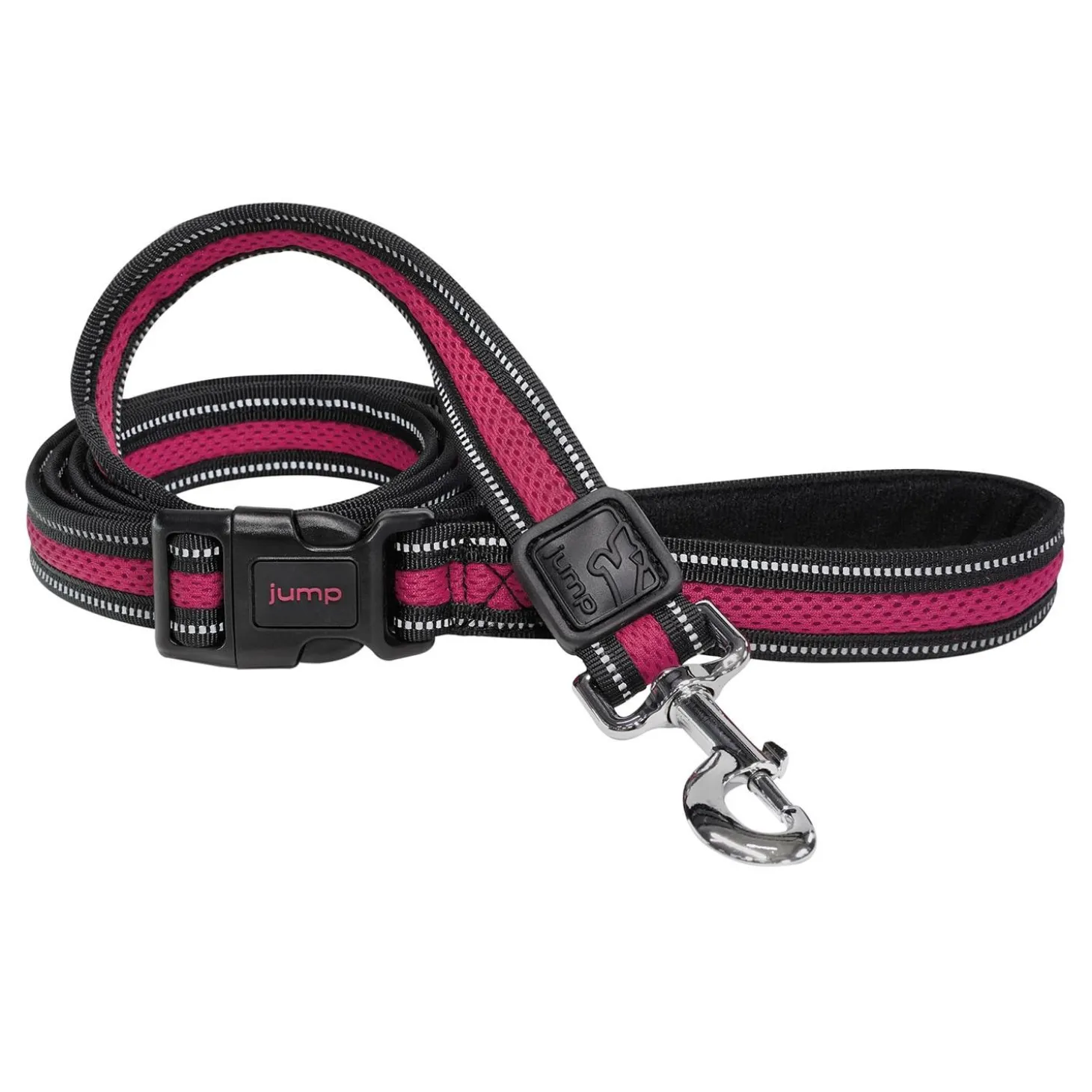 JUMP! Reflective Mesh Pink Dog Leash can be used three different ways. The side release buckle allows for hands free use by clipping it around your waist, over your shoulder in cross-body style, and as a traditional leash with padded handle for more comfort. It is light weight and reflective for added visibility during low light walks. Not suitable for use with a tie-out.