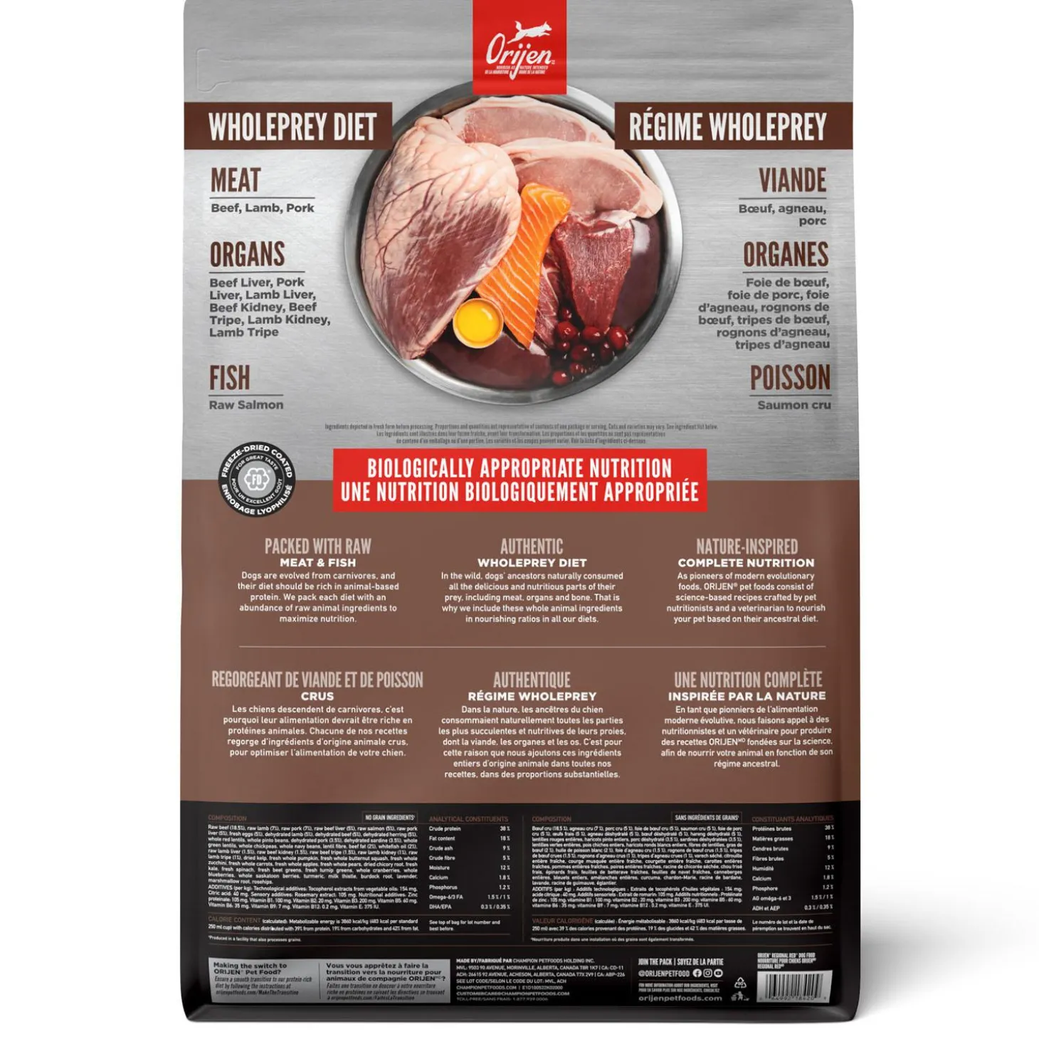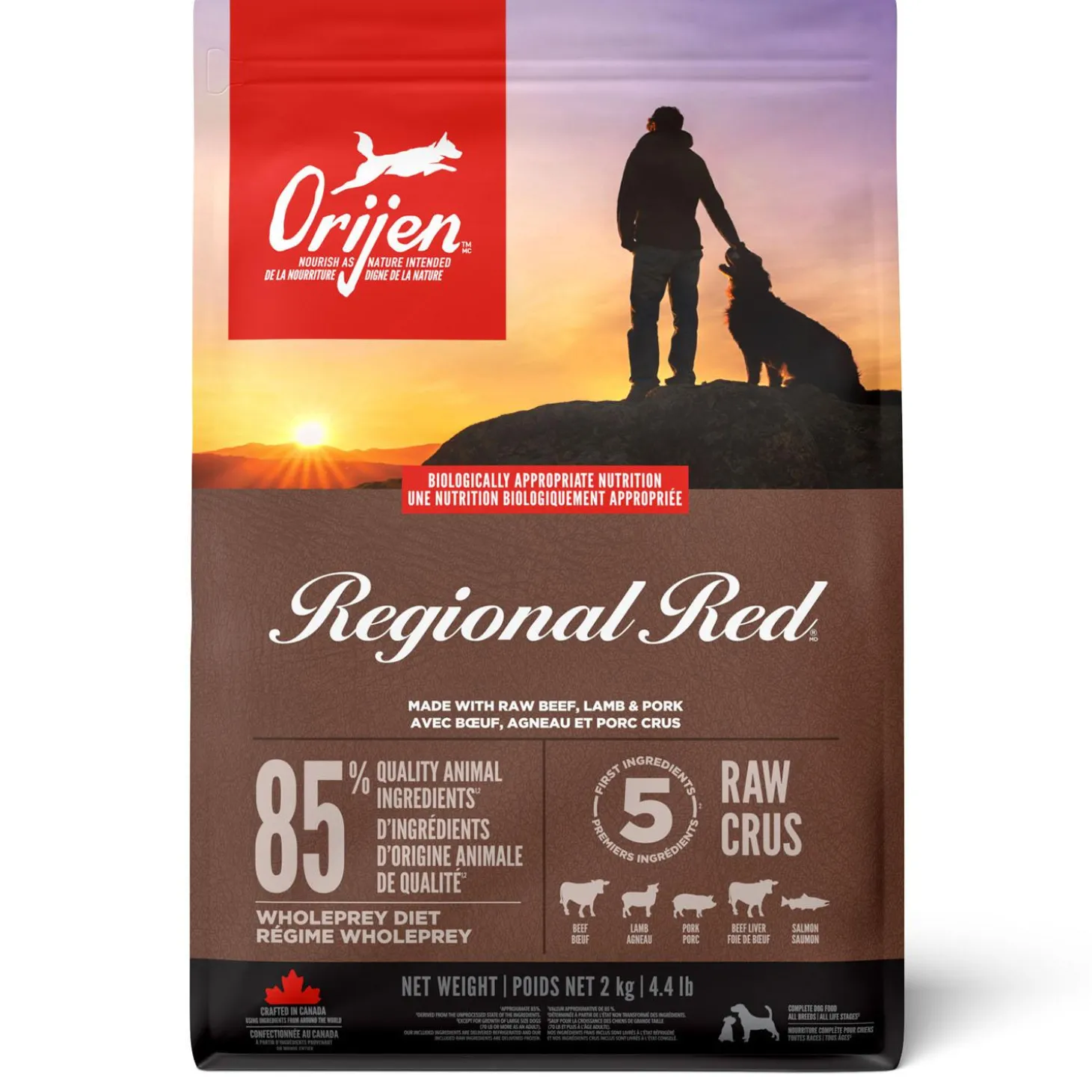 ORIJEN Regional Red Dog Food will help your dog thrive with the power of protein-rich recipes that provide peak nourishment. Dogs are ancestral carnivores, so they need a Biologically Appropriate diet rich and varied in whole animal ingredients. ORIJEN Regional Red diet is packed with 85%* quality animal ingredients like raw** beef, wild boar, bison, lamb and pork. Packed with Whole Prey animal ingredients like organs and bone, ORIJEN food is made with the most nutrient-dense, succulent parts of the prey to deliver the nutrition dogs need. The result is a diet for your canine companion that is beyond comparison.