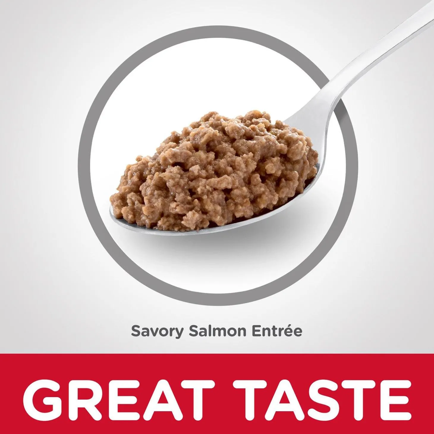 Hill’s Science Diet Savoury Salmon Entree Adult Cat Food tempts your cat with real savoury salmon in a soft, smooth texture. This food is made with purposeful ingredients for a flavourful, nutritious meal with an easy-to-digest balance of taste and nutrition. This wet cat food is made with natural ingredients that provides your grown cat with high-quality protein for muscle maintenance, as well as antioxidants, vitamin C and vitamin E for a strong immune system.