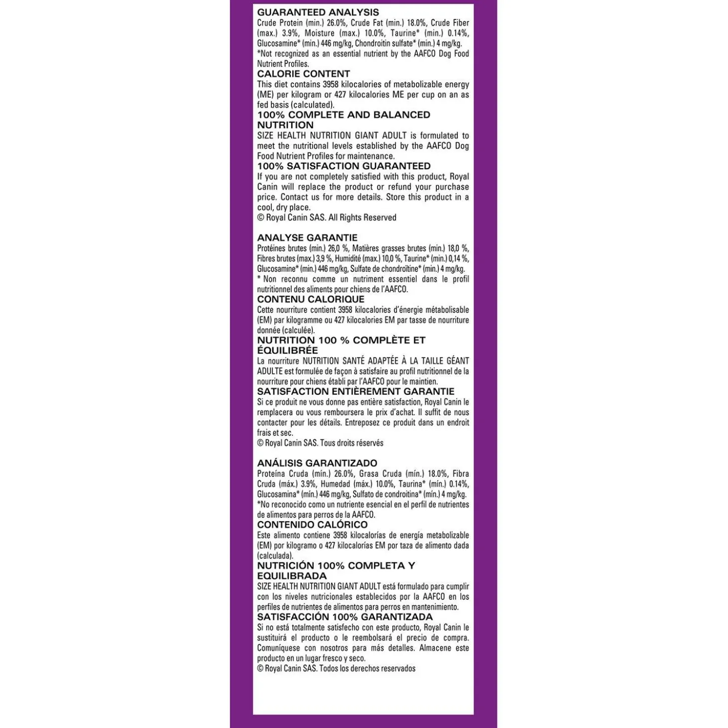 Royal Canin Size Health Nutrition Giant Breed Adult Dog Food will serve up the tailored nutrition your big dog deserves. Royal Canin makes it easier than ever to feed your big dog dry food. This extra-large dog food formula features a crunchy dog kibble texture your extra-large dog will love. Not only that, but this complete and balanced adult dry dog food provides the nutrition to help your best friend thrive. Glucosamine, chondroitin, and EPA/DHA in this extra-large dog food help keep your big dog’s bones and joints healthy and strong, while an exclusive complex of antioxidants supports cellular health. Nutrients like taurine help keep big hearts healthy, and high-quality proteins and fibers support digestive health. Giant dogs deserve an extra-large helping of nutrition. Promote your dog’s overall wellness with every Royal Canin Giant Adult Dog Food serving.
