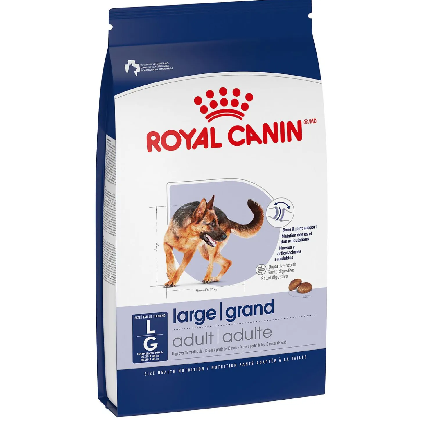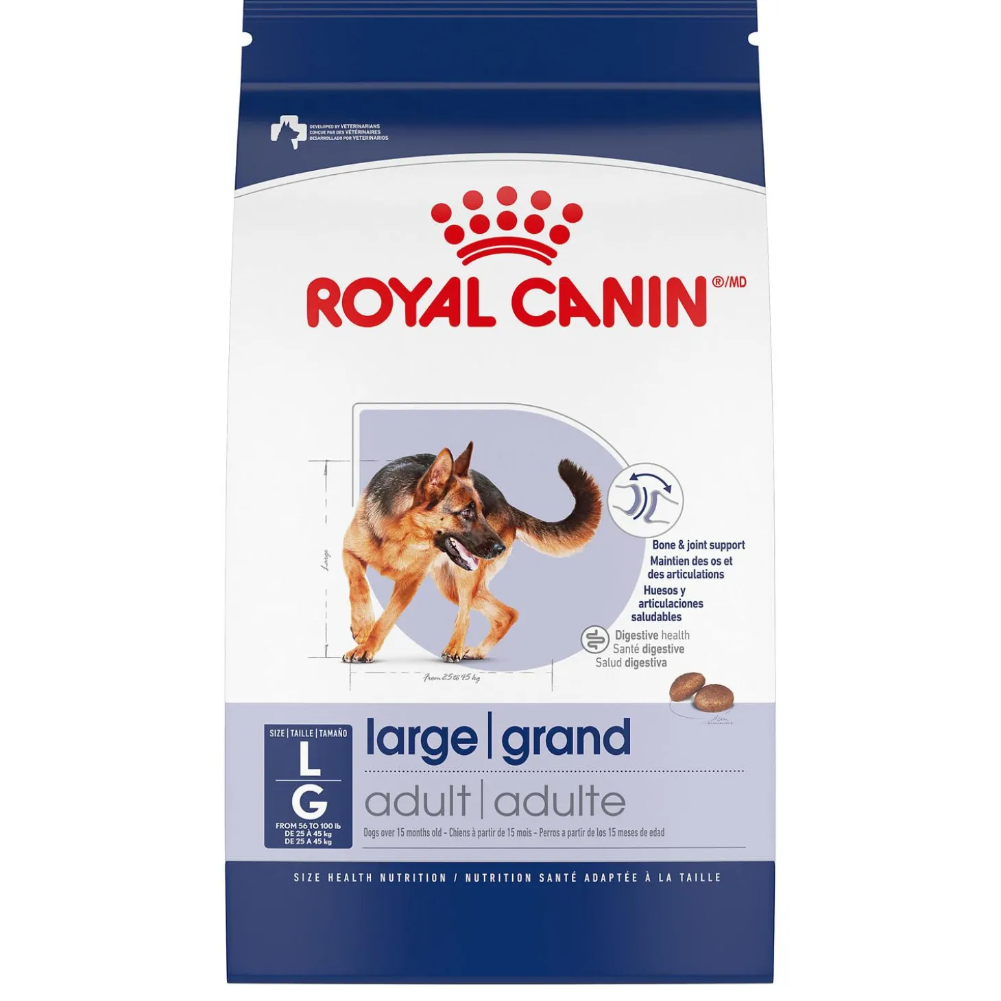 Royal Canin Size Health Nutrition Large Breed Adult Dog Food is formulated to meet the unique nutritional needs of large breed dogs over 15 months old, between 25.4-45.4kg (56-100 lbs).