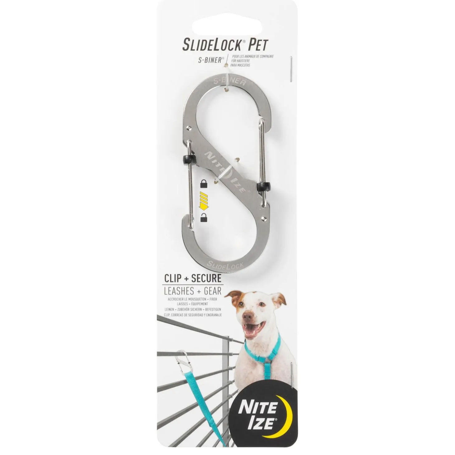 Nite Ize SlideLock Pet S-Biner will allow you to temporarily tether Fido to the base of patio tables, gates, and other public spaces. Simply clip their leash to one end of the SlideLock Pet S-Biner and clip the other end onto the object in question. Get creative in natural landscapes by looping their leash around small trees or columns, using the SlideLock to connect. Multiple dogs? Let SlideLock do the heavy lifting by connecting both leashes to each other for family walks and adventures. The dual stainless steel gates stay closed with just a slide of the locking levers, preventing breakouts and easing worries with a strong stainless steel body. In between stops, you can stay on doody duty, simply clipping their roll of bags to the leash with the S-Biner. After your long day of fun, hang up their leash at home with a simple clip onto any hook, and do it all again tomorrow! Be sure to only use SlideLock Pet with a tie-out approved harness and never leave them unattended.