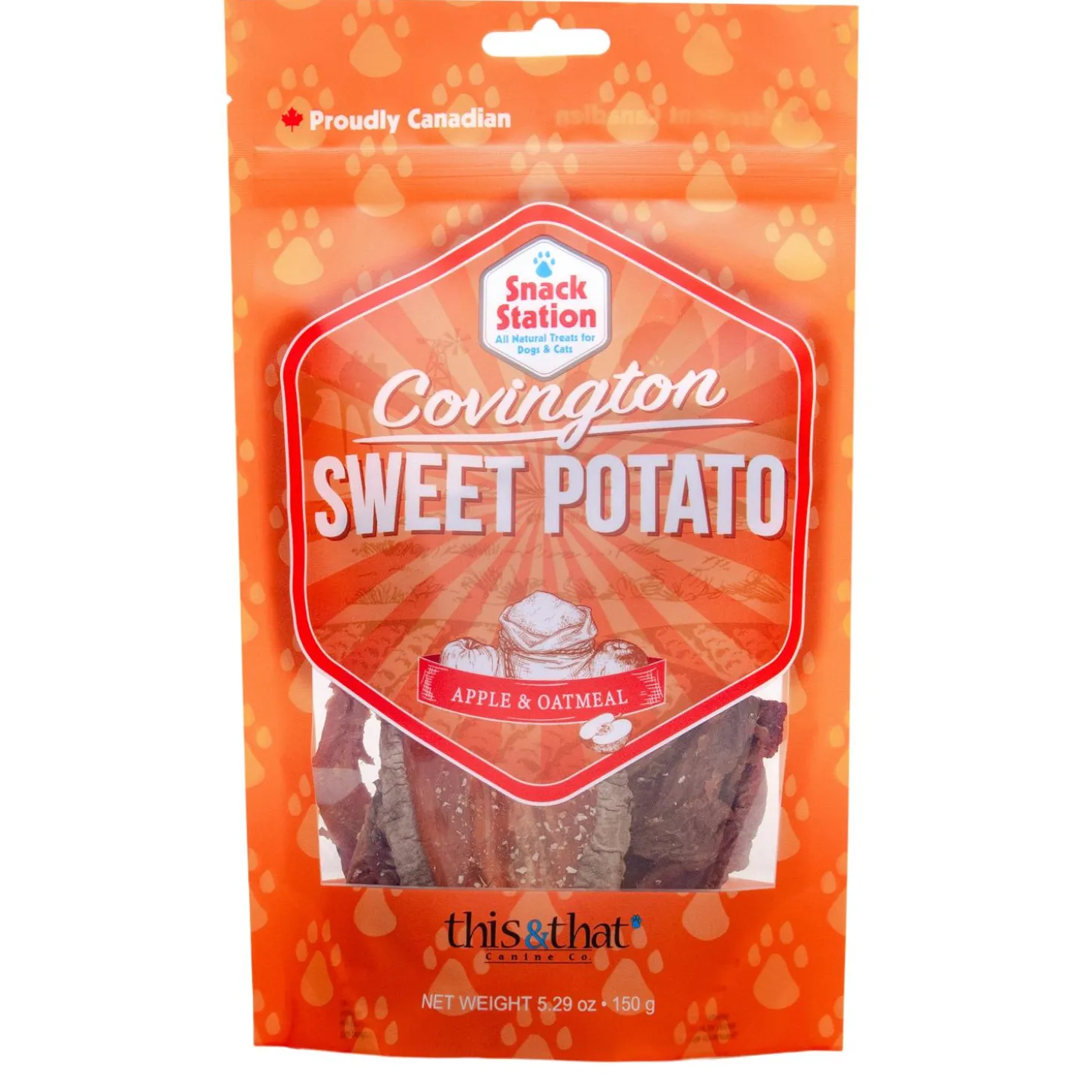 This & That Snack Station Covington Sweet Potato Apple & Oatmeal Dog Treats are high-fiber, high nutrient, teeth-cleaning chews. Soft dehydrated chew. Perfect for sensitive tummies. Apple is vitamin rich. Oatmeal is great for skin and coat.